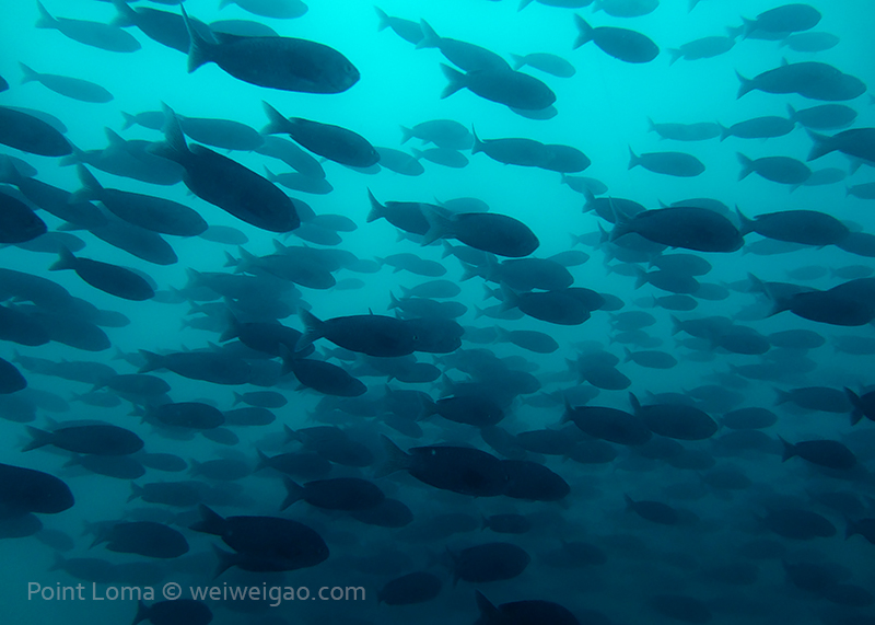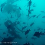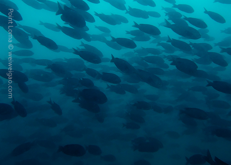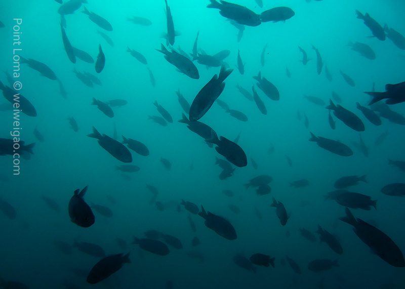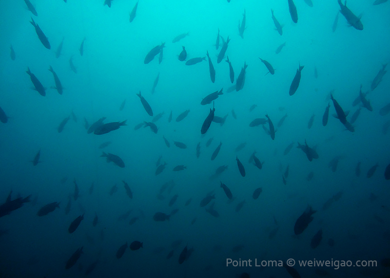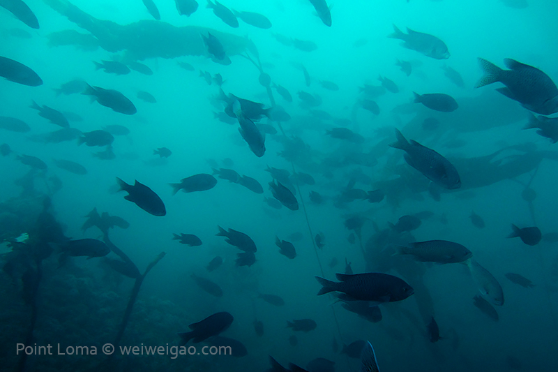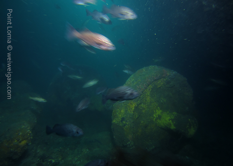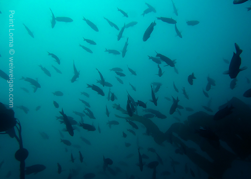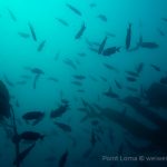 From there, we went back north to Train Wheels and got distracted by several whales, including two that went straight under the boat maybe 10ft deep. There we found poorer viz ~ 10ft but a lot of life as usual: crabs, lobsters, blacksmith, opaleye, sheephead. A sea lion paid us a visit in the cave scaring all the schools of smaller fish that were hanging in the water column. A word of caution: there is a lot of fishing line there that could get dangerous and we will remove it next time we get there.