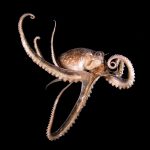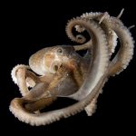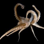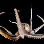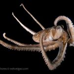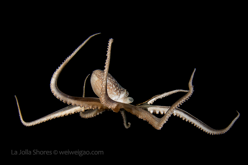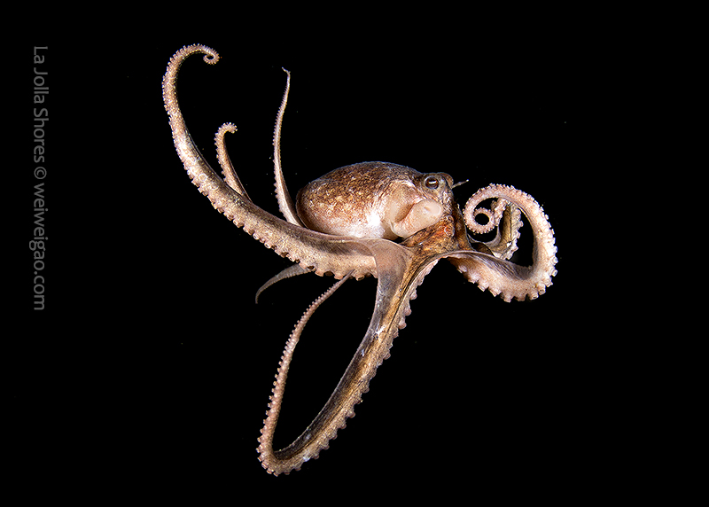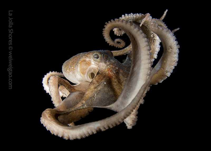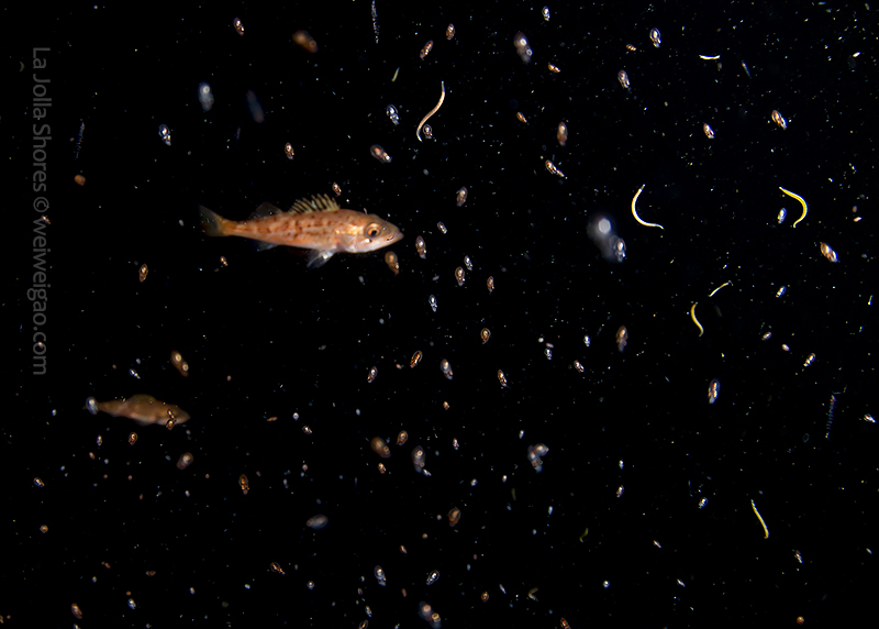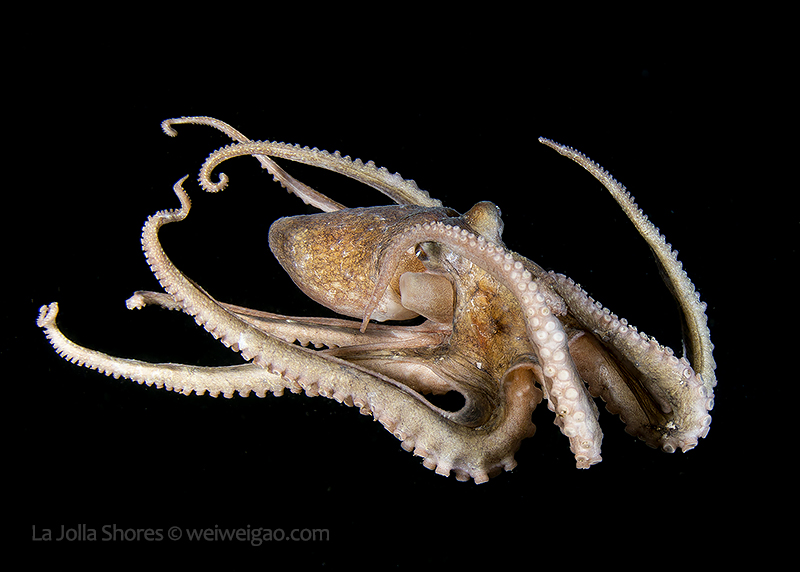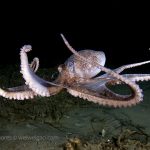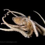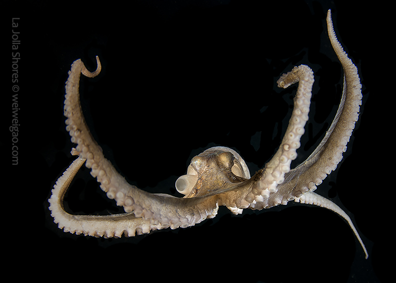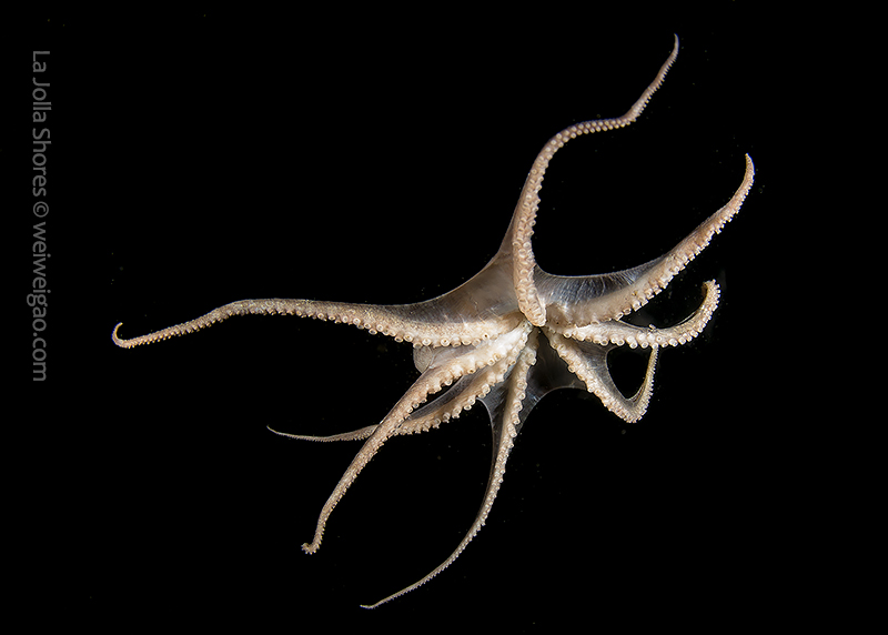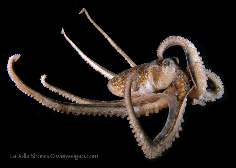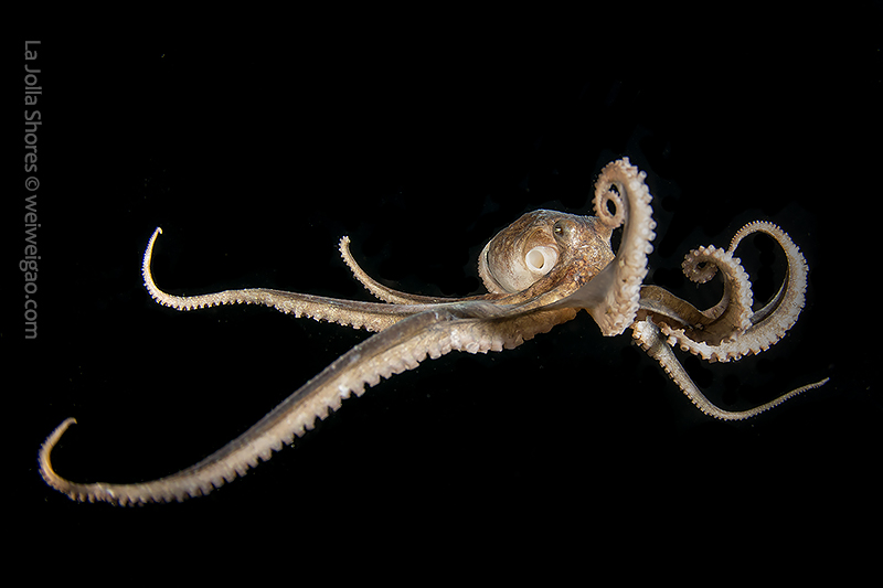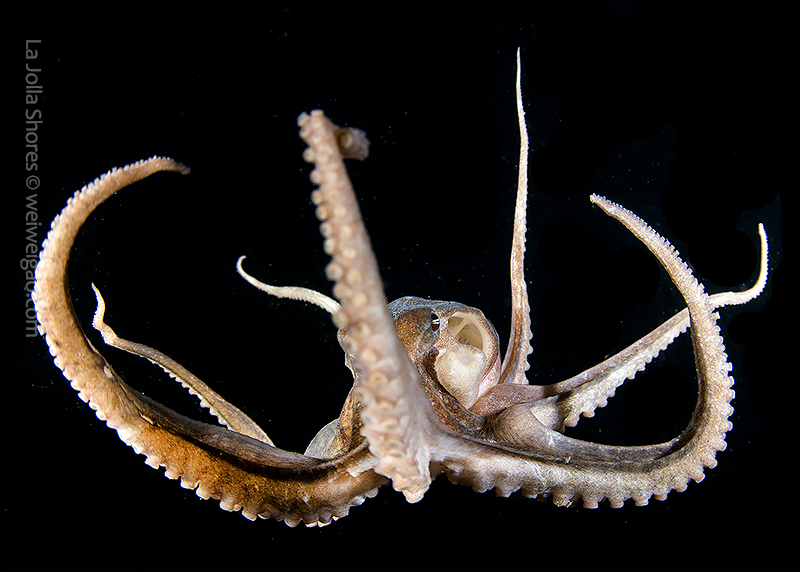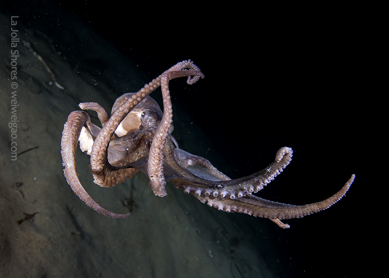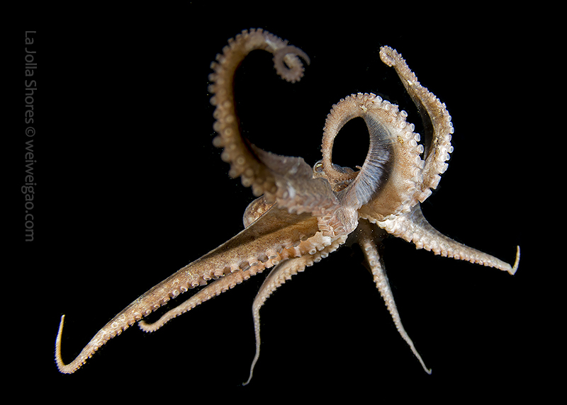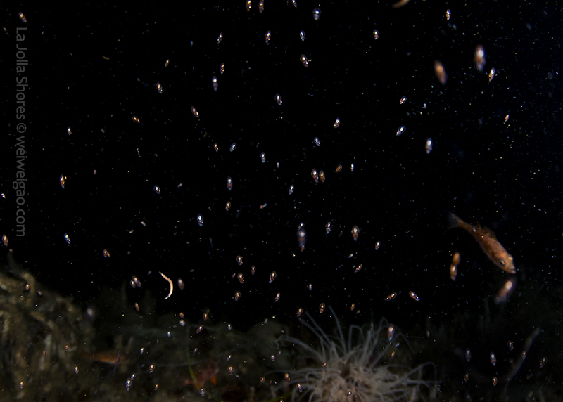 The fantastic condition is held at the shores and I headed out for a night dive. I cruised the canyon toward the south. While I was photographing a tube dwelling sea anemone, I noticed that my light attracted lots of baby octopuses.