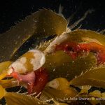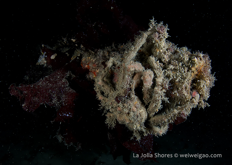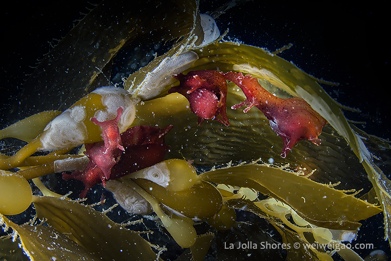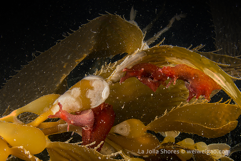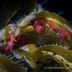 A few pictures from tonight at the shores. Nice conditions. I decided to check out the south wall (aka ‘yellow crab city’) for a change. The first interesting sighting was a big bundle of kelp near the main draw area teemed with sea hares.