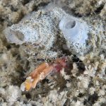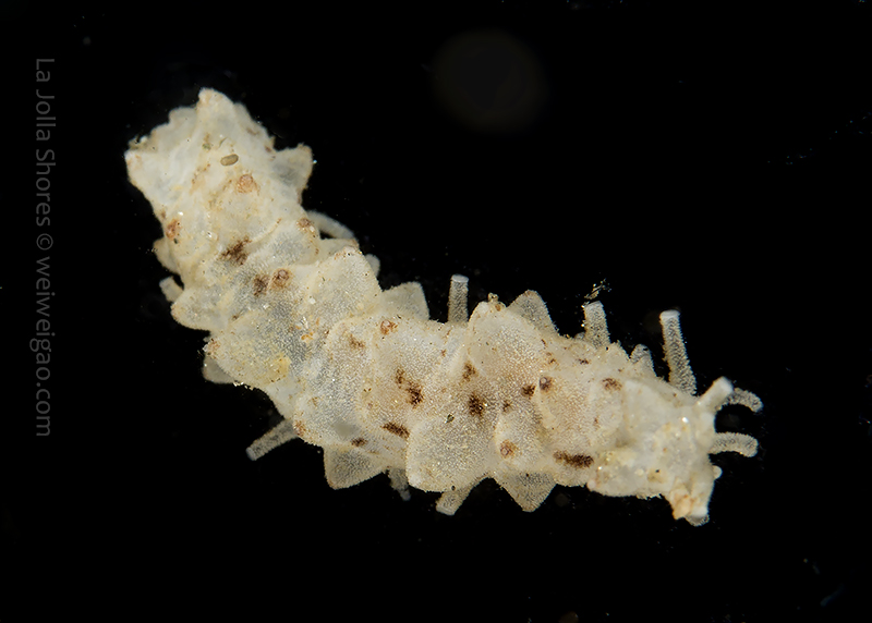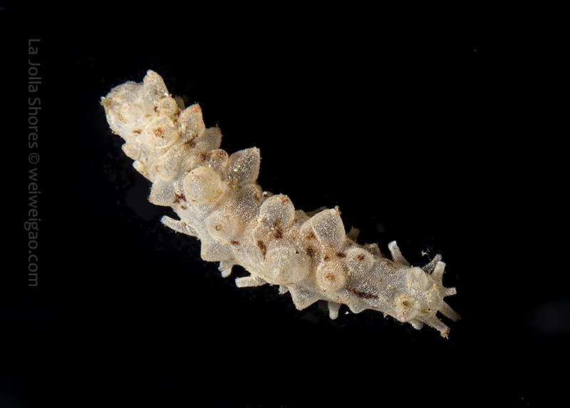 It’s about 1″ in length and it crawls. Later on, I found out it was a baby white sea cucumber. Very cool encounter.