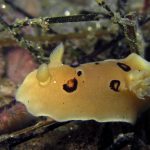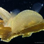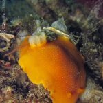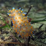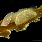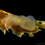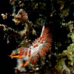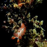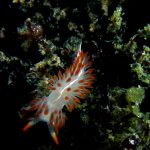 On the patch, I spotted a three-lined aeolid (Flabellina trilineata). Although it was so tiny, it stood out with a bright red color.