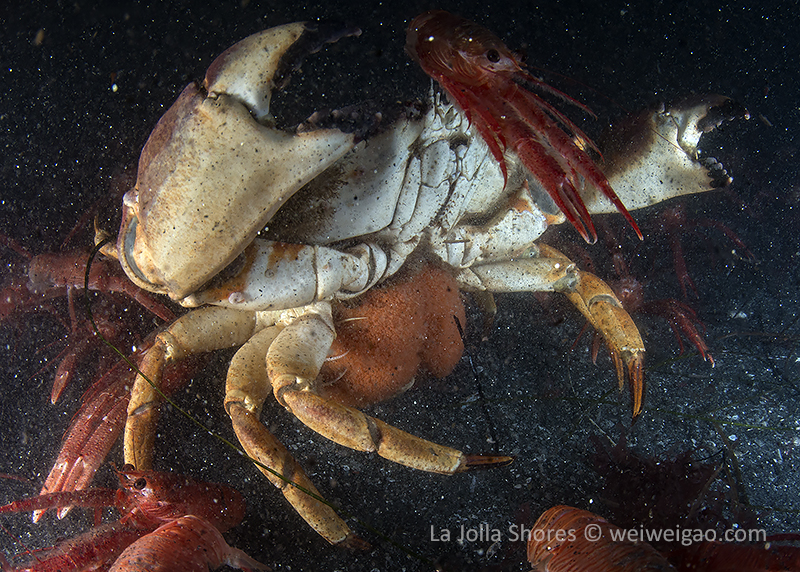 When I got close, I noticed the egg she was carrying. It was a good size female crab. I followed her a little while. But the crab was crawling pretty fast. With lots of tuna crabs around, it’s actually hard to keep up with her.