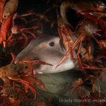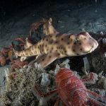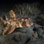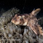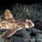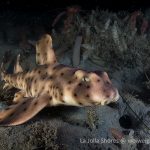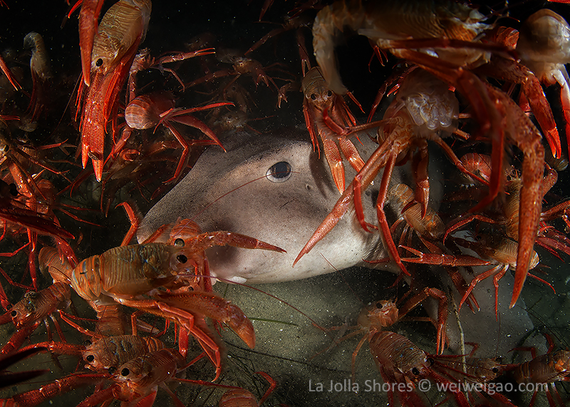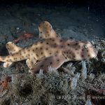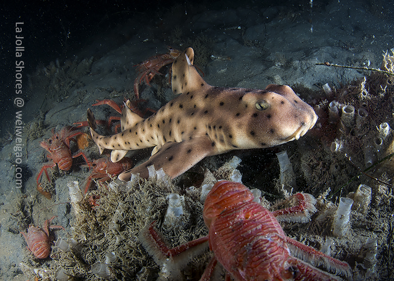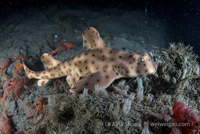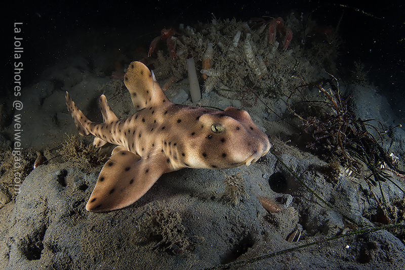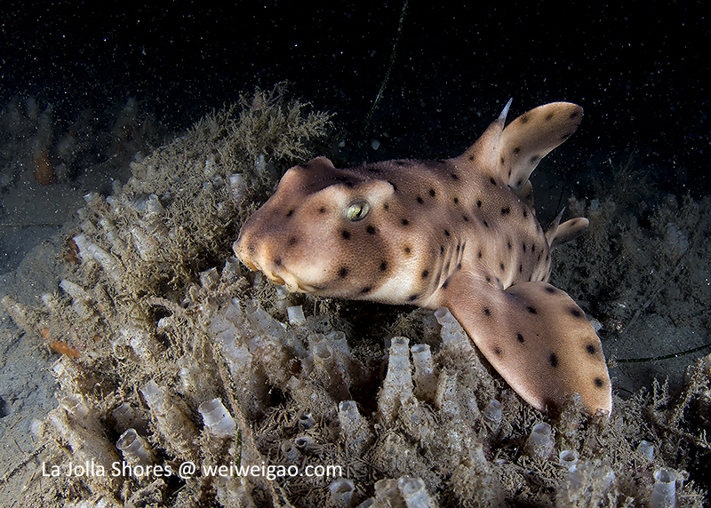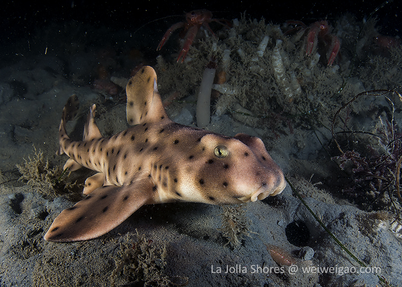 After the yellow crab disappeared in the darkness, I continued cruising toward south. After a little while, I spotted a juvenile horn shark, a perfect subject to practice wide angle.