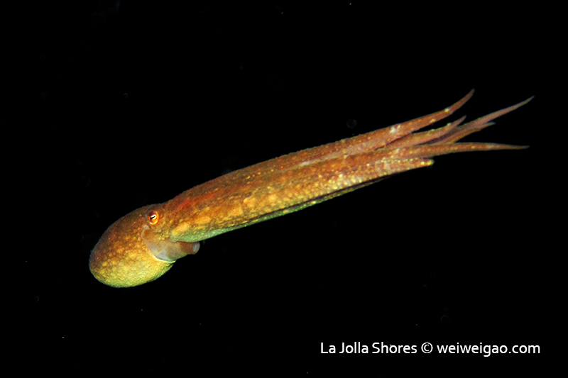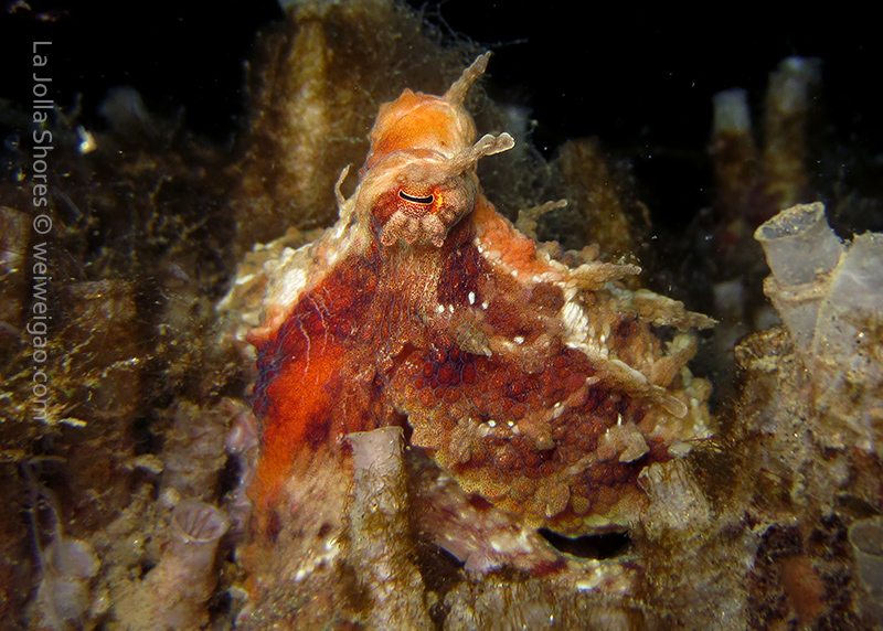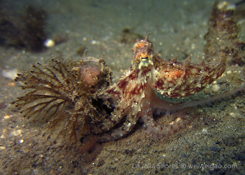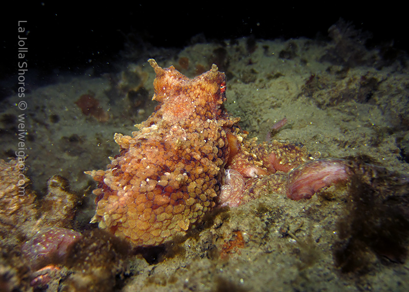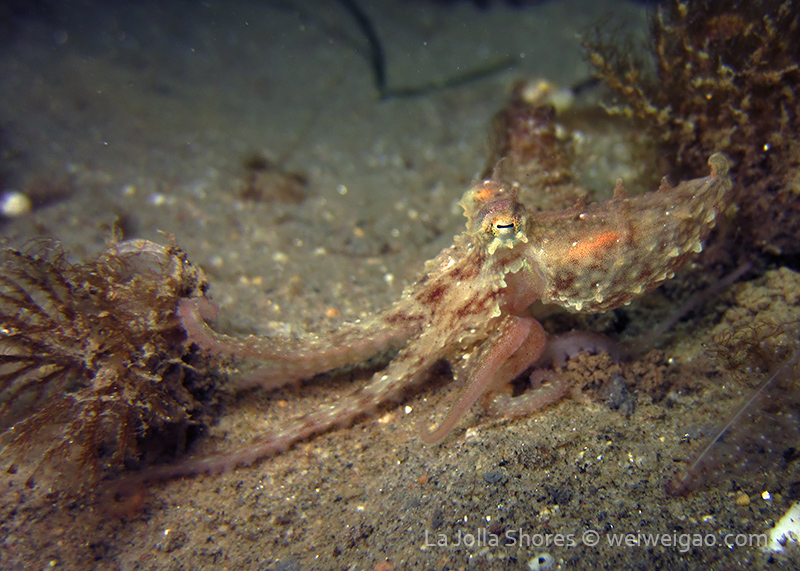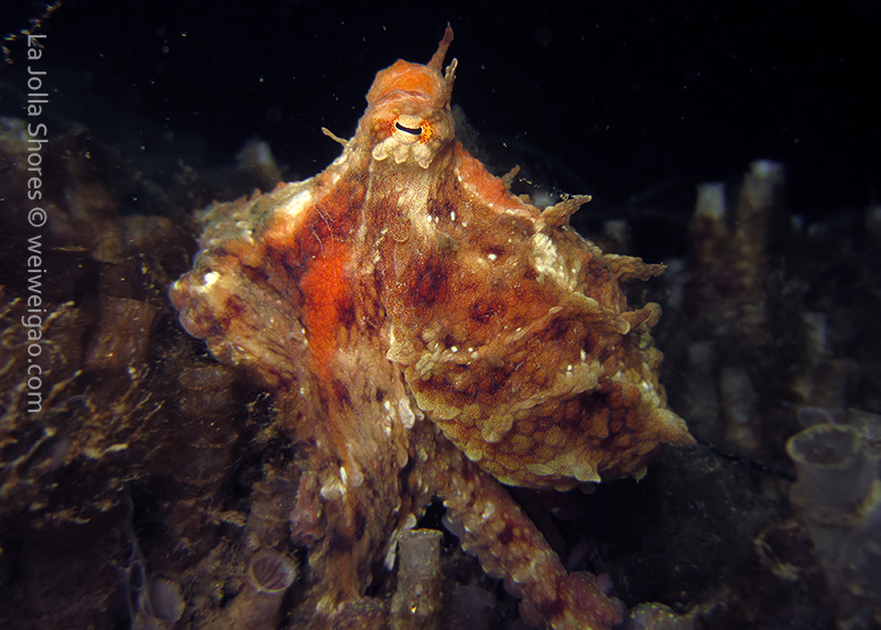 The night belongs to the octopus. They are all out, hunting on the canyon wall.