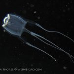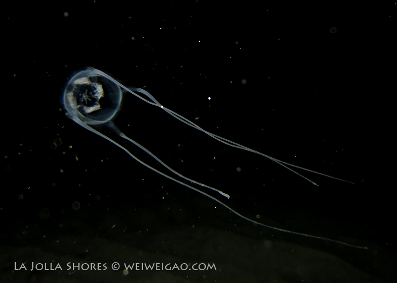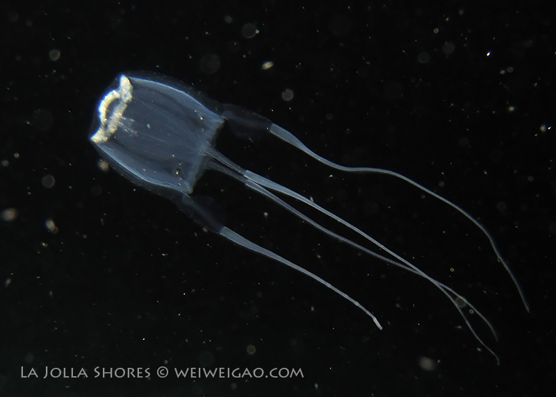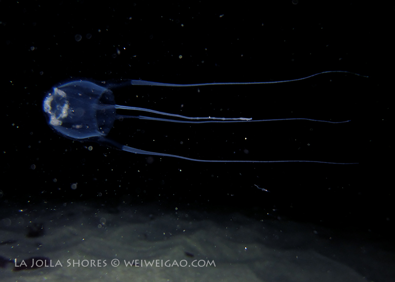 Headed out to the shores for a night dive. The sea was calm and the water was warm. As soon as I dropped down to the sandy slope, I came across a box jelly.