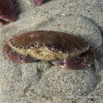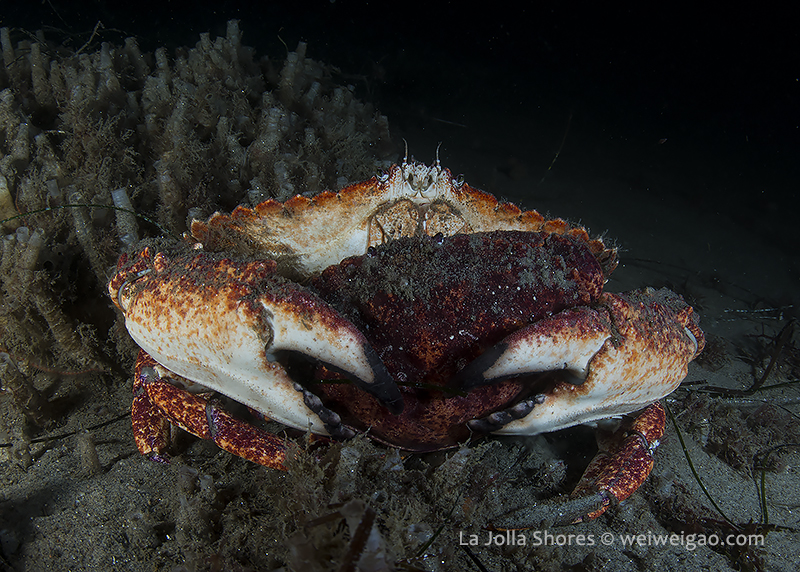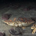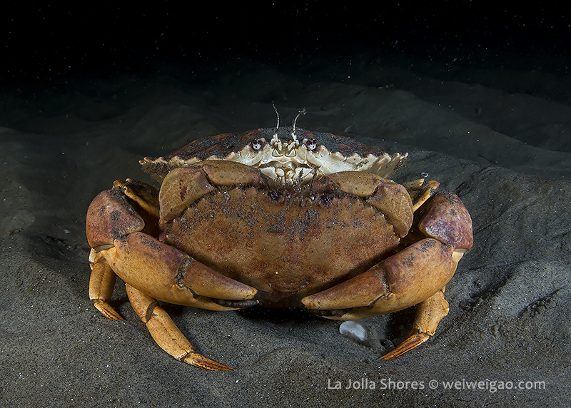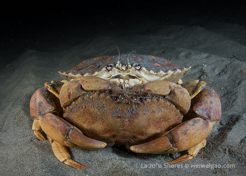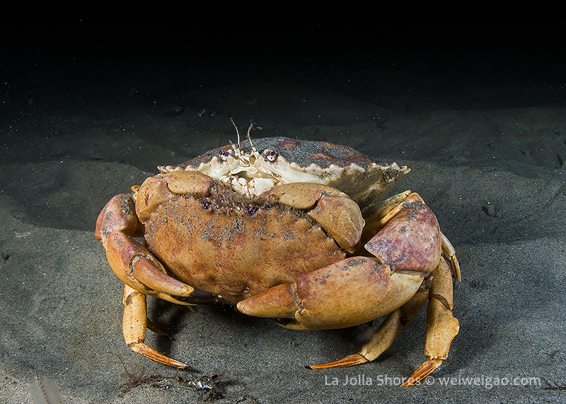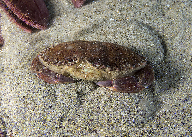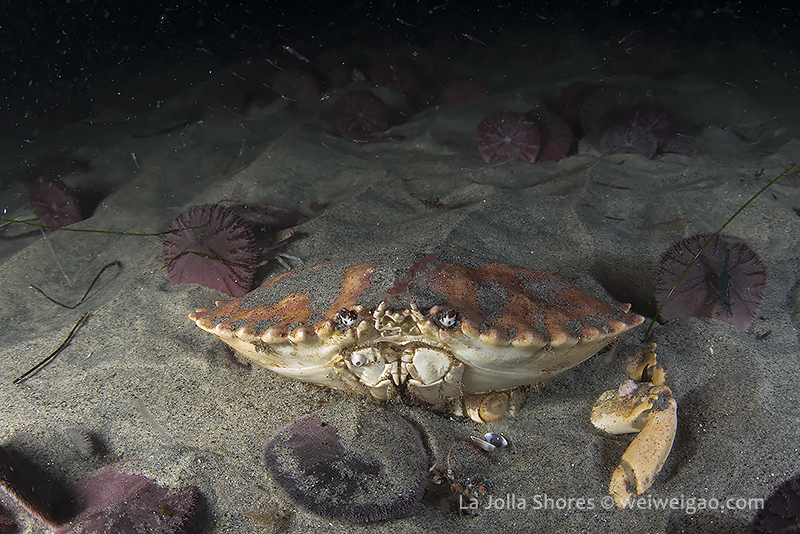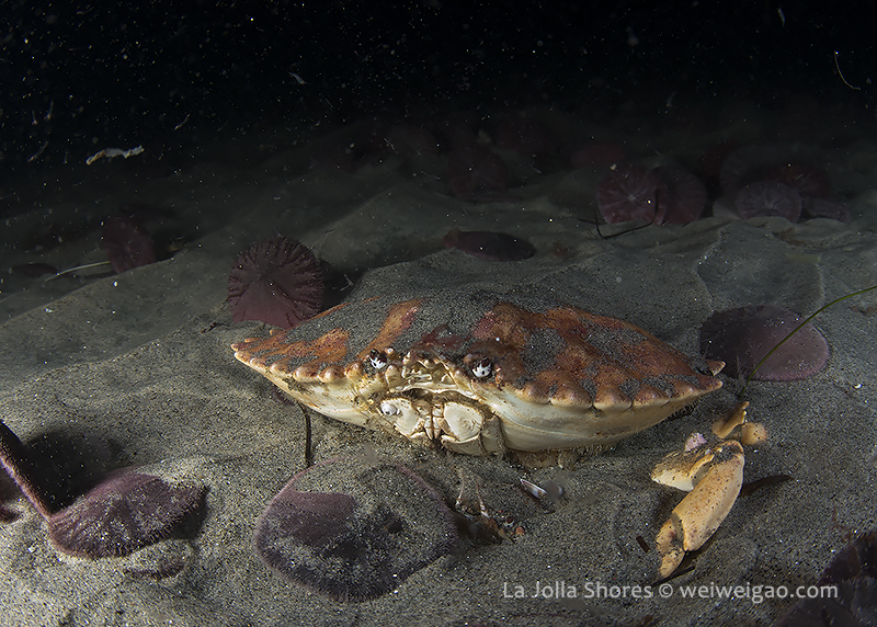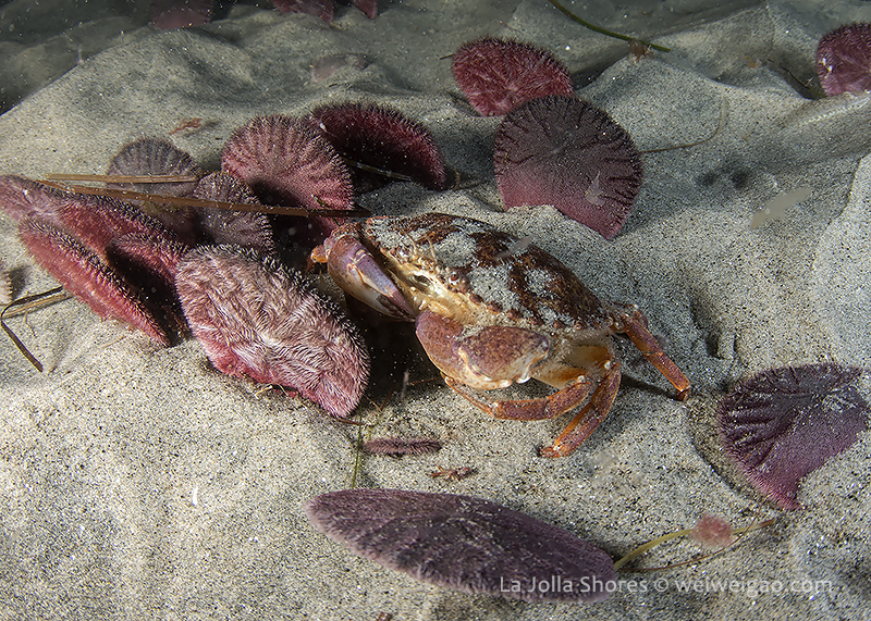 A pebble crab (Cycloxanthops novemdentatus) at the sand dollar field