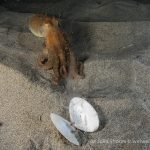 In the shallow at the sand dollar field, I came across this yellow crab which lost both claws…poor guy