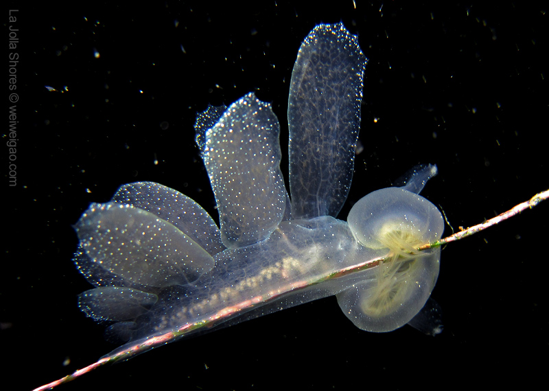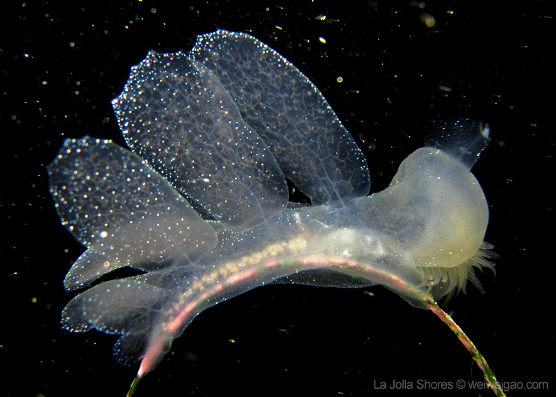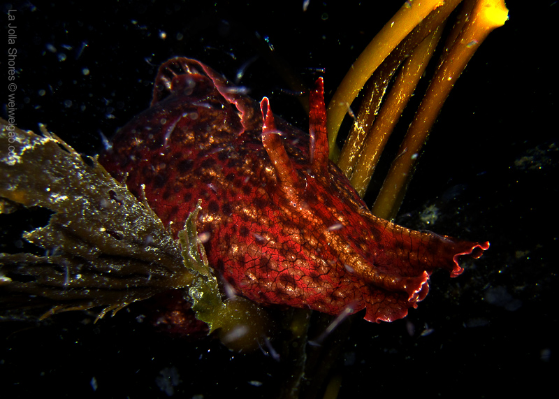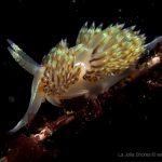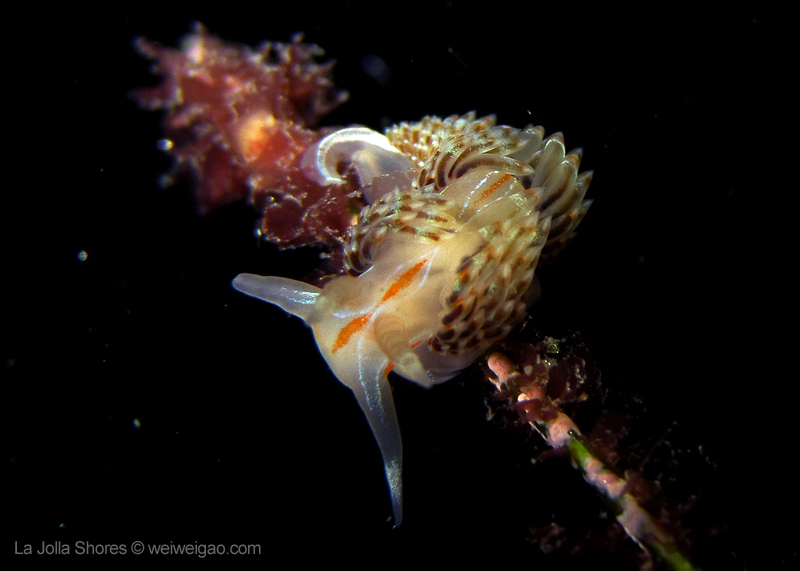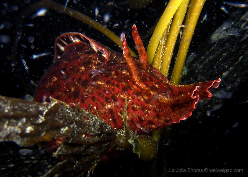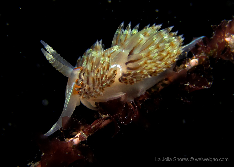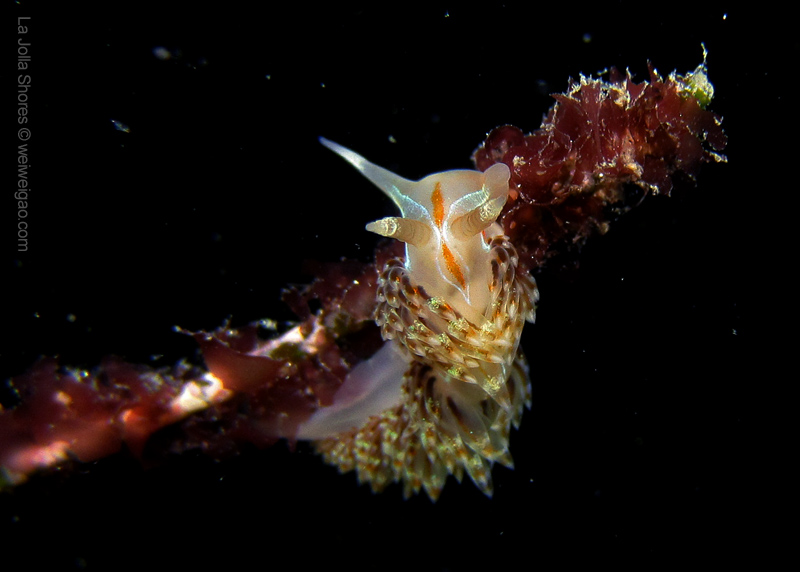 Exactly 12 hrs after Gayle’s report – the dive condition remained about the same except that the wind died down. The surf was minimum. Headed out with beautiful sunset to the crap patch. The visibility at the sandy flat was poor and salad-like. But near the canyon it was much better. I came across a lion’s nudibranch on grass as opposed to kelp – a great opportunity to see it from all angles.