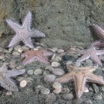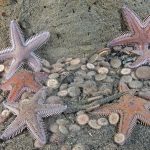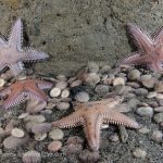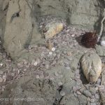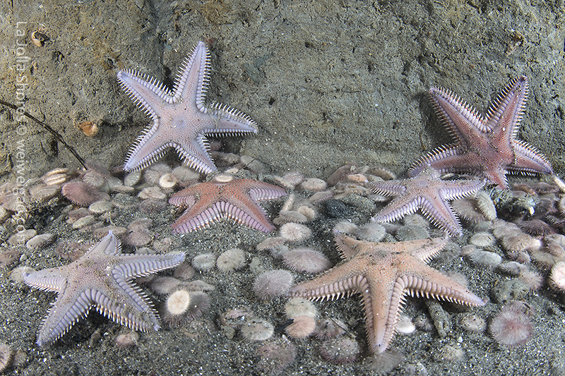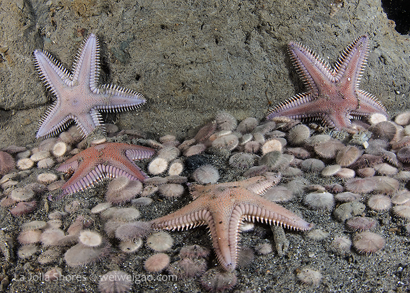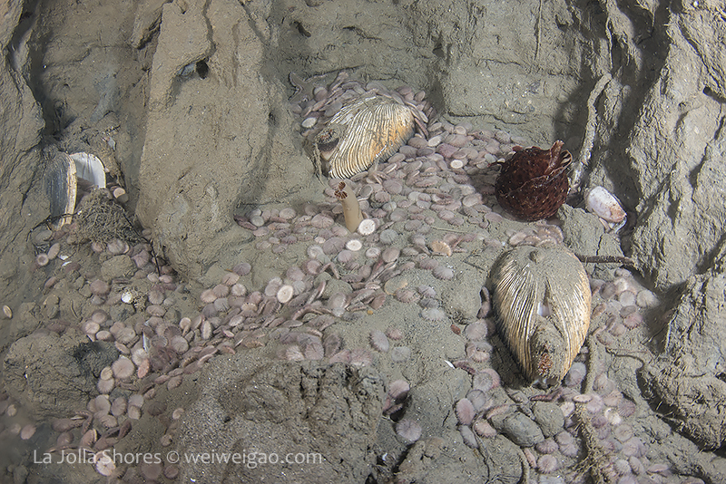 I headed toward the south. At the bottom of the canyon ledge, there was a ton of baby sand dollars washed down from the sandy slope. At one location, quite a few spiny starfish gathered.