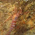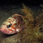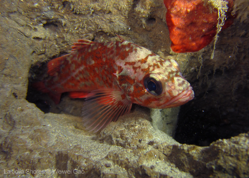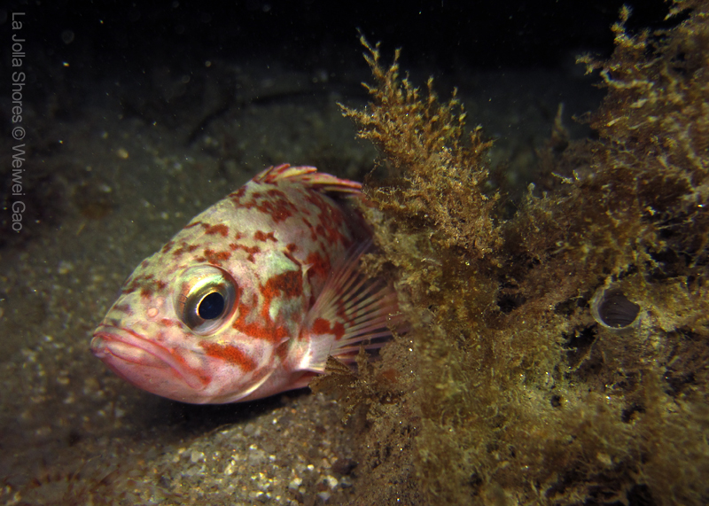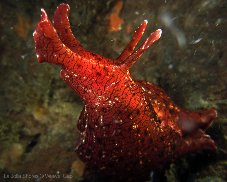 There was a strong north current in the very shallow close to the beach but once I passed the surf zone, it was calm. I dropped off at the middle slop. The visibility was superb! At the canyon wall, I spotted a brown sea hare. It was crawling on the wall and obviously had difficulties to hold on to the rock even though the surge was pretty mild. Finally it fell to the sandy ground.