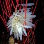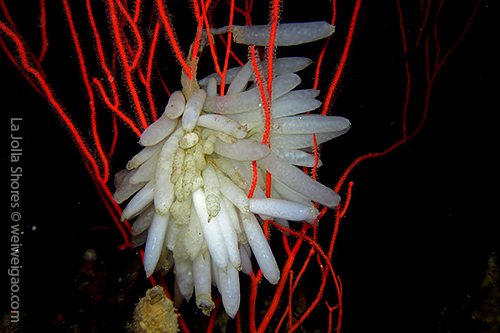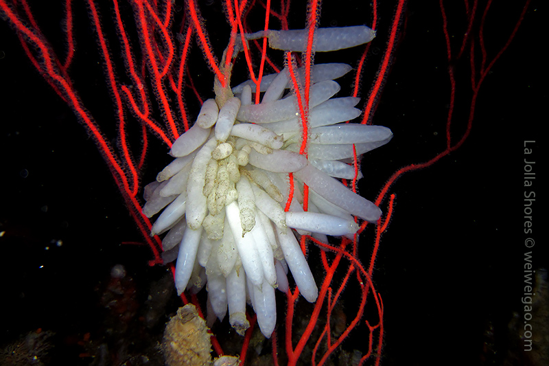 The visibility was pretty, even though it was a bit surgy and the water felt colder than I had expected. I followed the draw to about 90 ft and turned south. A few kicks later, I was at the secret garden. From afar, I noticed a big white mass hanging on a bundle of red gorgonian. Up close I found out it was squid eggs. Here and there squid eggs started to appear. I hope I can see a squid run soon.
