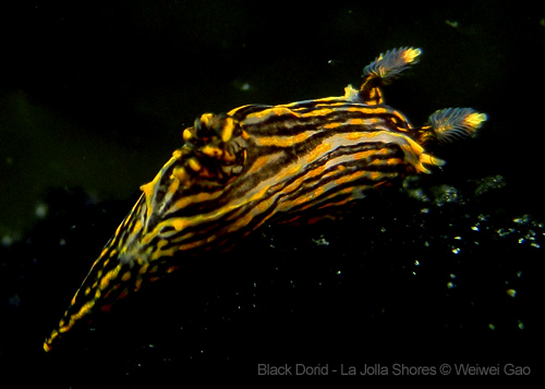 Then we turned and swam up along the slope. The water was so clear that I could see pretty far. The majority of the slope was covered by the grassy patches and the area was teemed with life. I was hoping to find a black dorid and it happened. But the little nudibranch was so tiny and taking a picture of it was difficult.