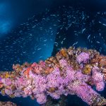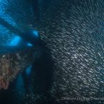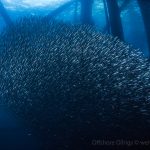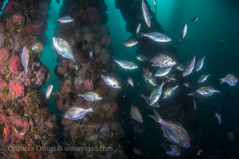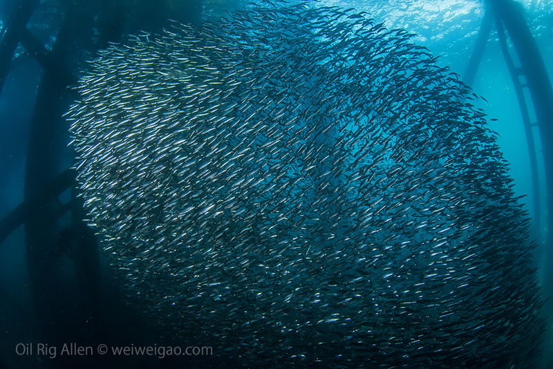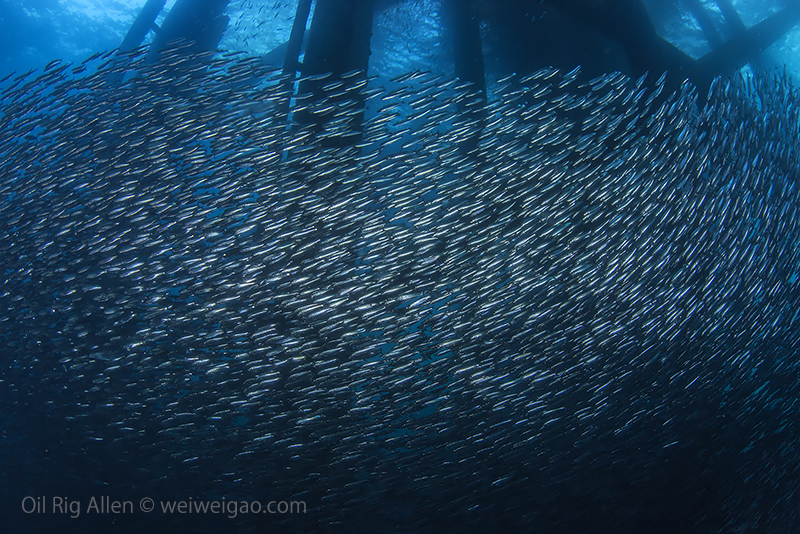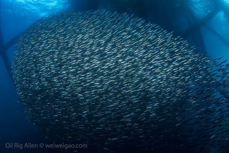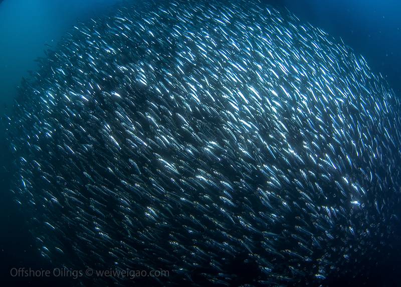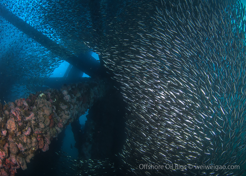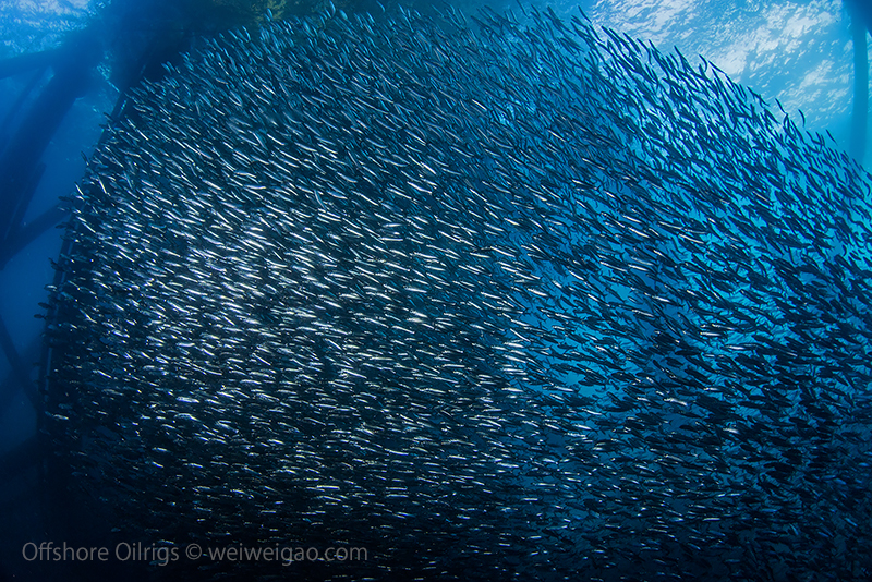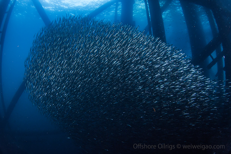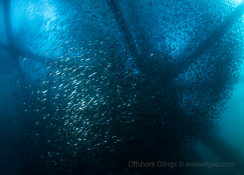 But my dream shots for the oilrigs are those with the large school of bait fish. Today’s condition was good and we had a large school. But the fish was mostly outside of the rig structure. Once in a while, the whole school would swim into the structure but capturing the moment was difficult. I had a few moments of encountering them. Here are the set.