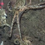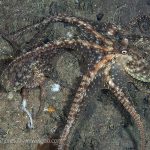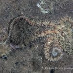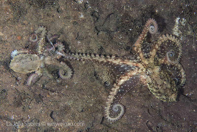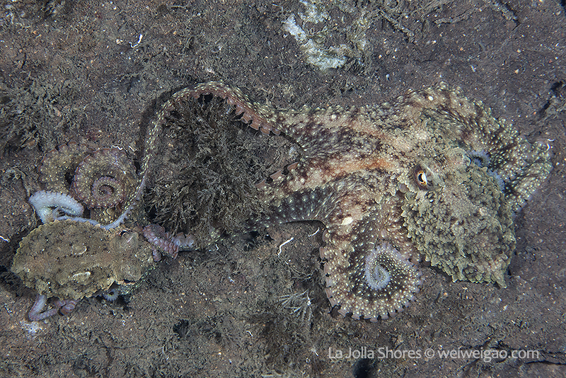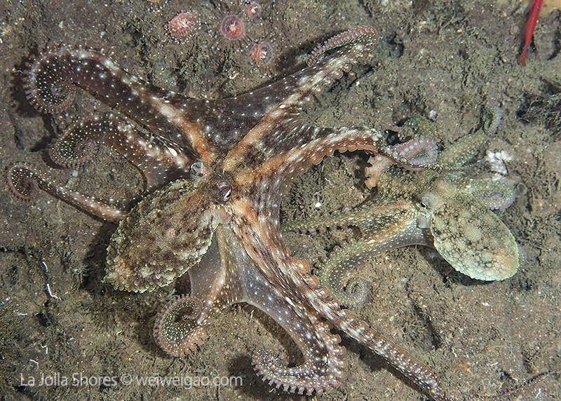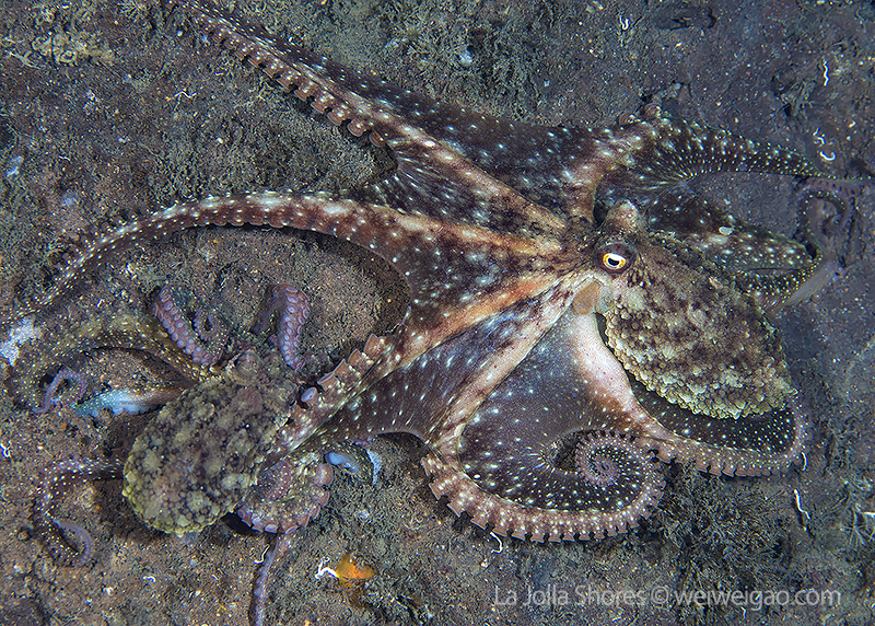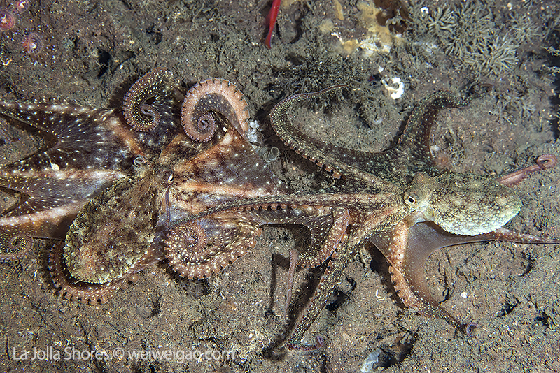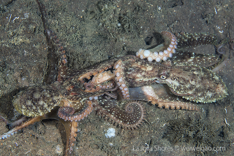 Most of the time, the two stayed in crevices about a foot apart, flirting by extending one arm out and touching each other. At certain moments, the female would go all the way out toward the male, devouring her smaller partner under her arms. The two became tangled and twisted. Then, in the blink of an eye, they were apart, back to their crevices.