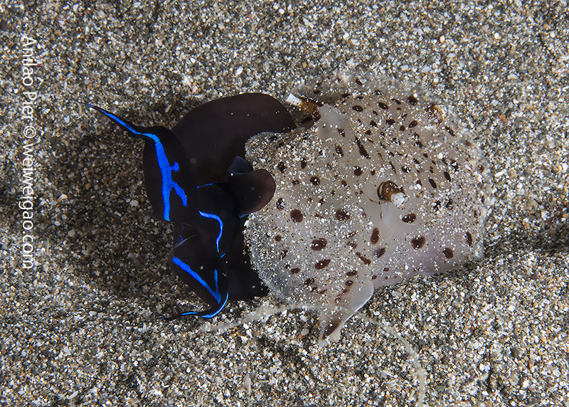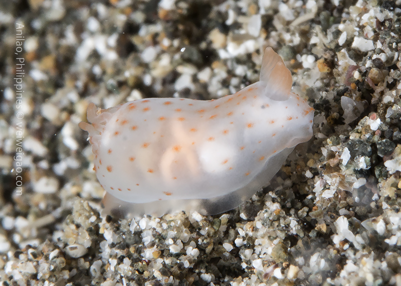 But most of the nudibranchs are extremely tiny. I was not familiar with the species and Carlo kept on pointing new ones to me. This was a Gymnodoris citrina on the sand.