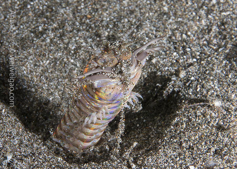We found a squid hunting on cardinal fish. When we approached, the squid spit out the fish and fled. Carlo used the half fish and lured out a Bobbit worm. I was excited to see one.