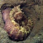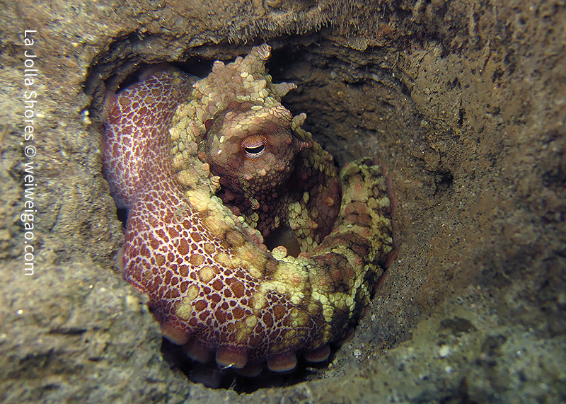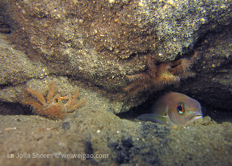 As we neared Engine Block, viz went to heck again. Tons of Octos out and about, the Cardinalfish den is full, and is also being occupied by various sized Sheephead. The hole next to it is full of Cleaner Shrimp who scurry away too quickly when they see light.