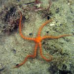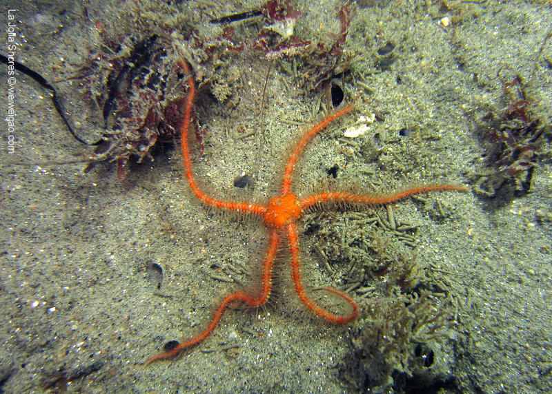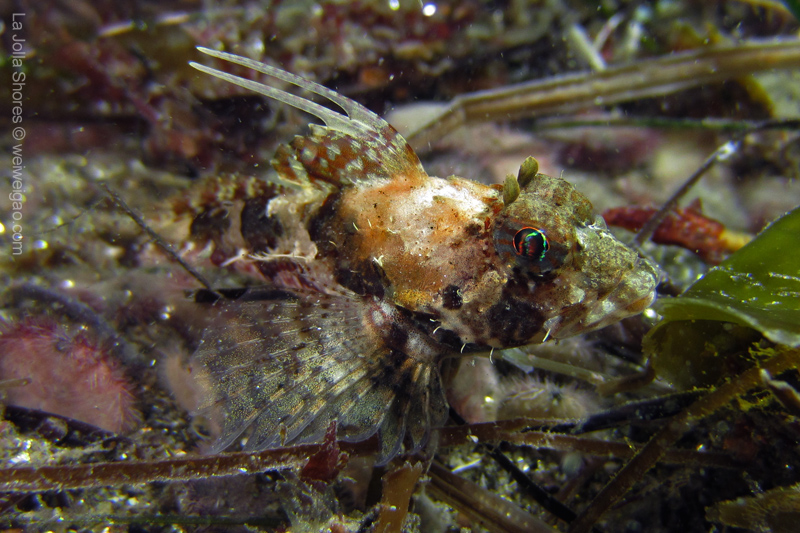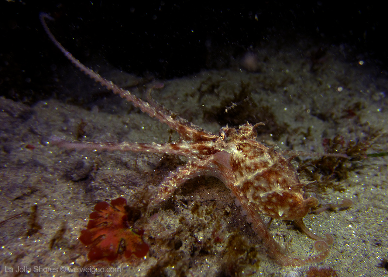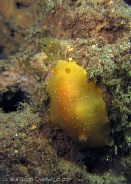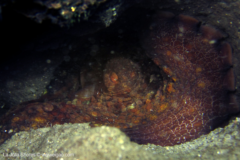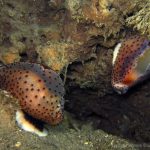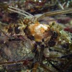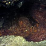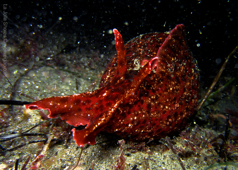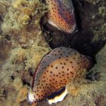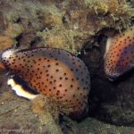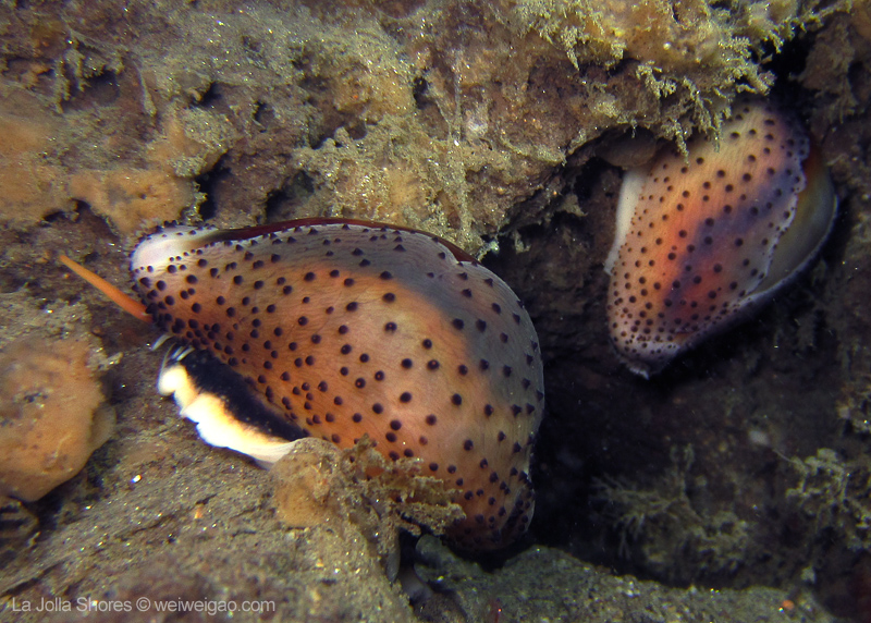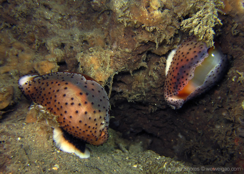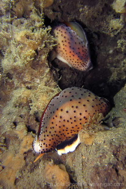 From the patch I headed to the V-point. The visibility was okay near the wall (~15 ft) until a sea lion and harbor seal came along. This pair stayed with me for the rest of the dive, messing up the viz and unwilling to go away. Near the V-point, a pair of chestnut cowrie was hanging out.