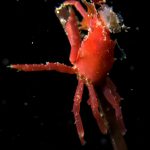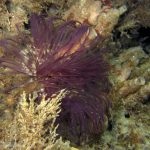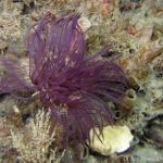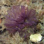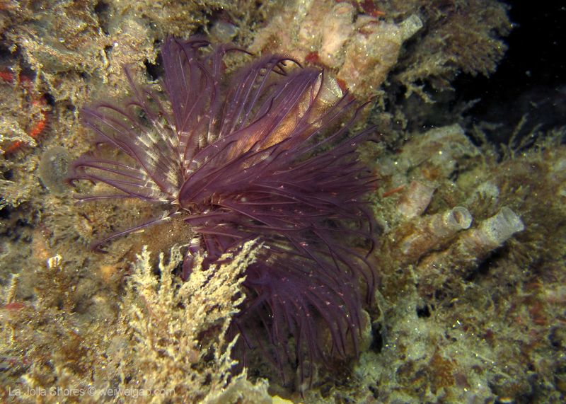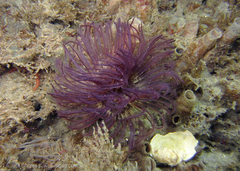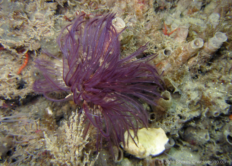 I climbed over the canyon wall and spotted this beautiful flower-like thing with a bright purple color. It is the tentacles inside the tubes. The brilliant color strongly contrasts the dull tubes. They are very shy, retreating back to the tube with my slightest movement.