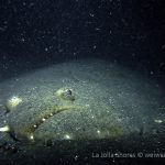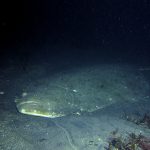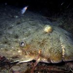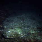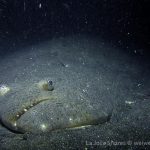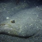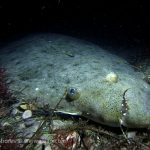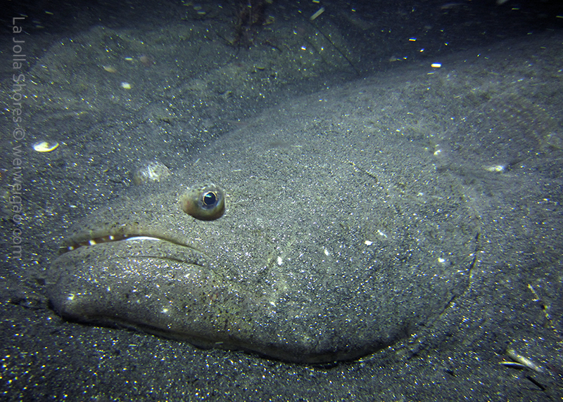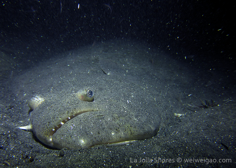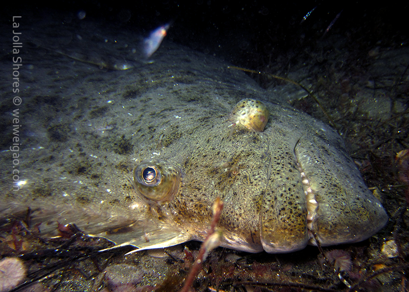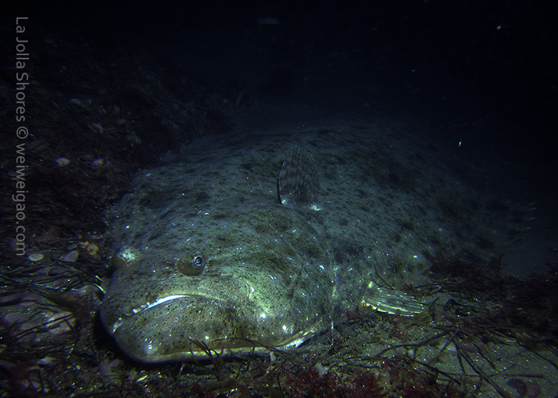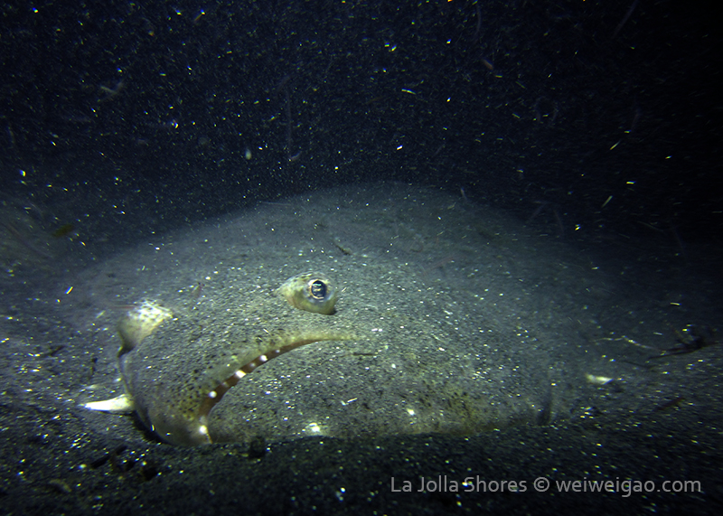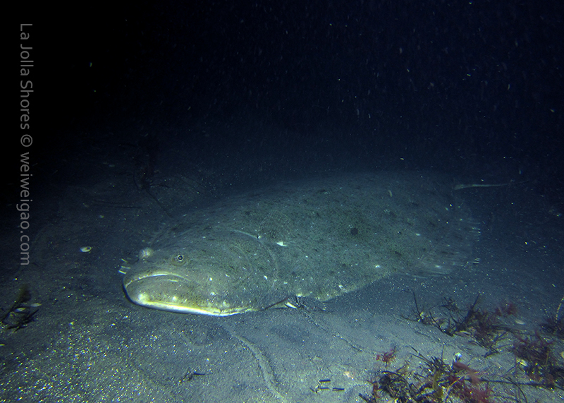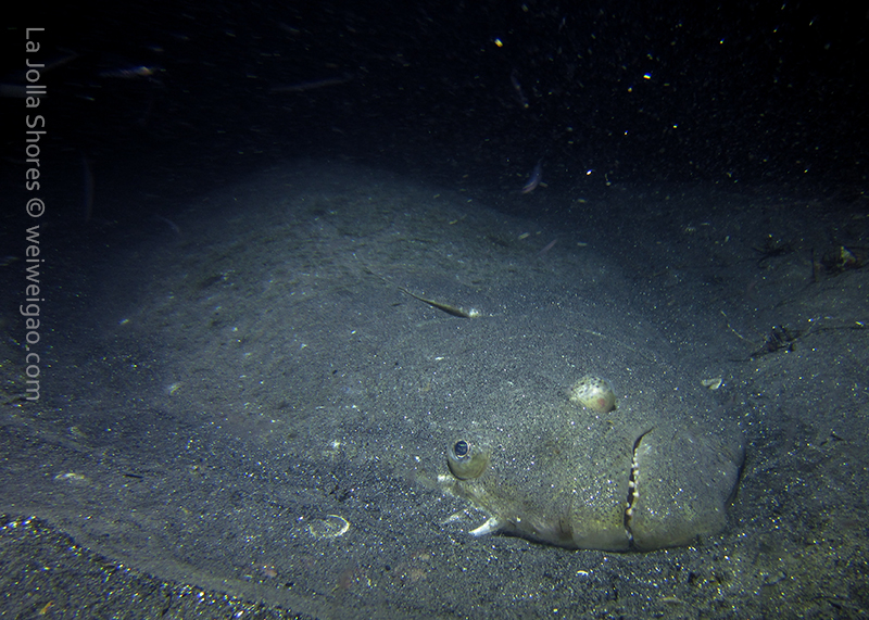 I didn’t spend too much time and turned south. A small sting ray caught my attention. While I was following the sting ray, it brought me to the big halibut. Once in a while, the big halibut came and rested at the crap patch. The sheer size of this fish was breathtaking – which was about 4.5 to 5 ft long, and fat, covering a quite large area on the ground.