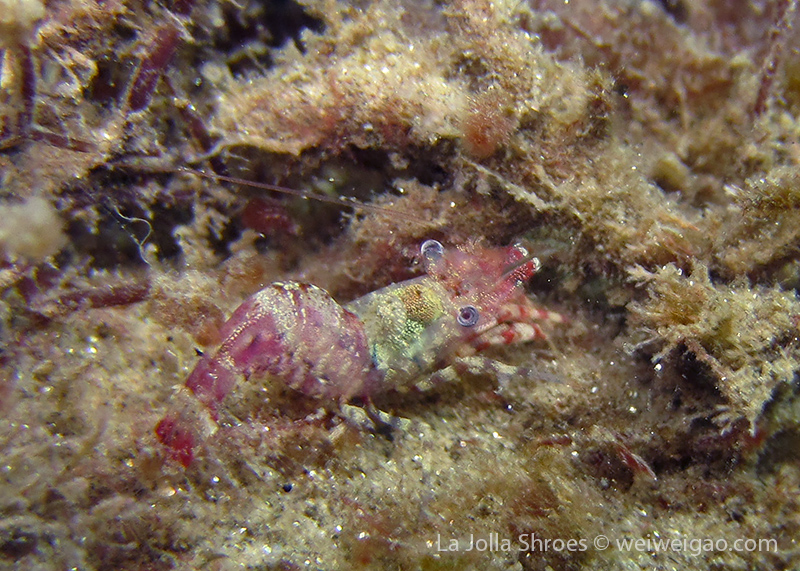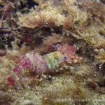 I went all the way to the pipe. Near the south wall, the visibility dropped even more. In fact, the visibility at the south wall has been pretty bad for a long time. The up swell keeps stirring up all the mud. When I got to the pipe, it’s already the time to head back. I took a quick scan, not any nudibranch in sight. But the shrimp was hanging in the algae.