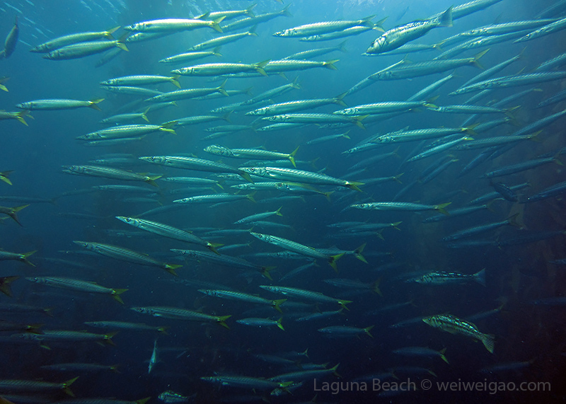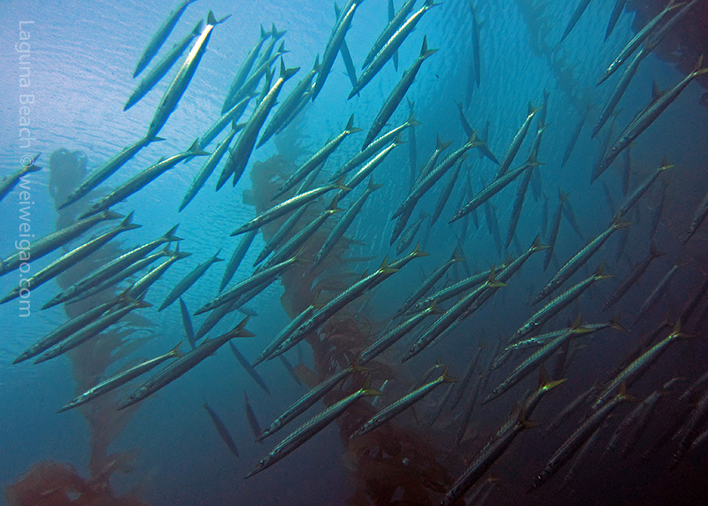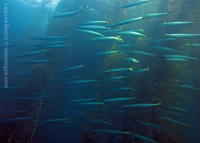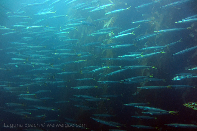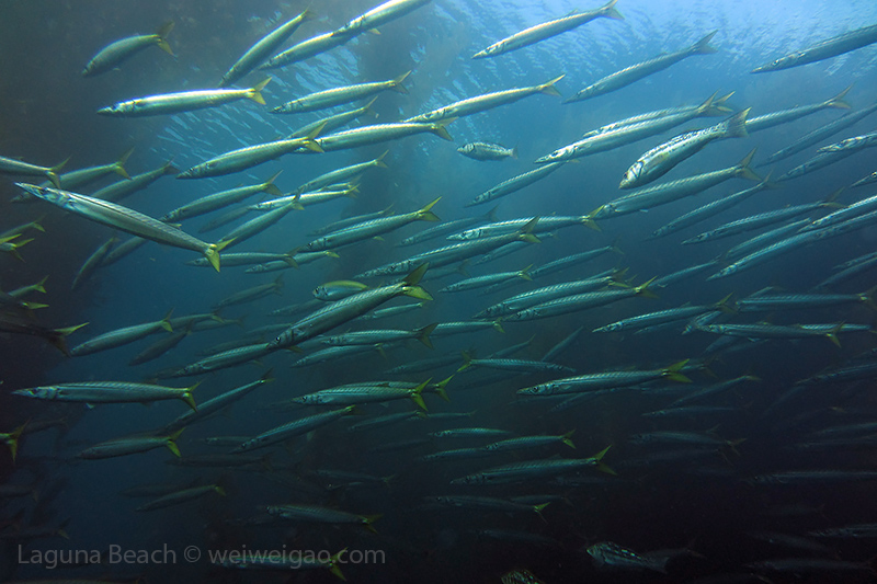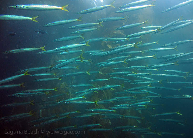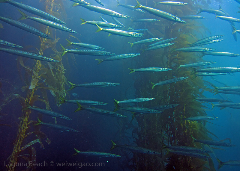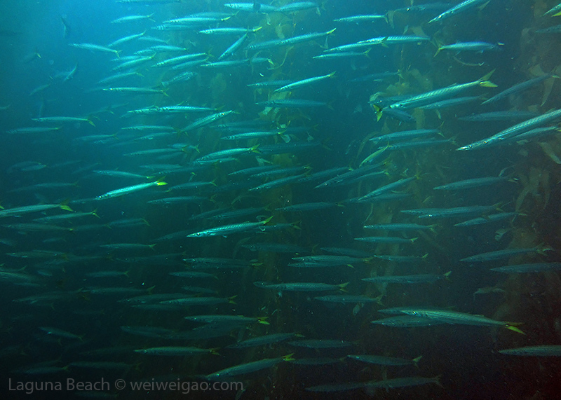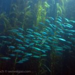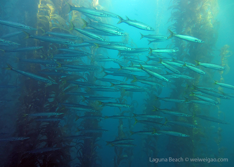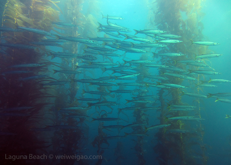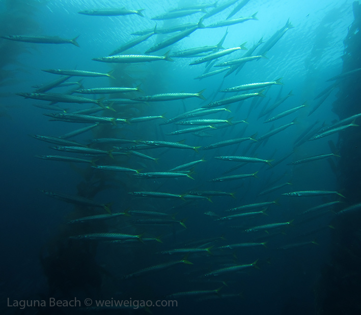 I want to take a break from the sheephead and turn my head to the deep forestry. Then I saw a huge school of California barracuda. It is so large and the whole school of fish forms a wall – something I have never seen before. I am stunned, staring at the fish. I saw smaller schools at the cove before. In my impression, California barracuda is kind of shy. But this school is different. They don’t really swim away from me so I actually get really close. It is a breath-taking experience.