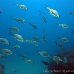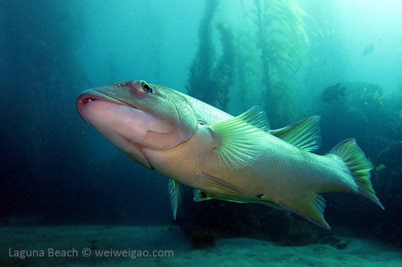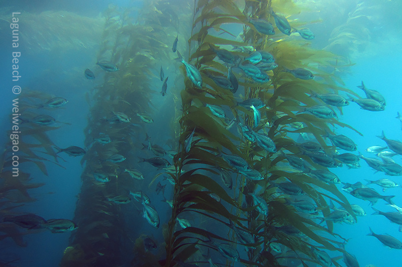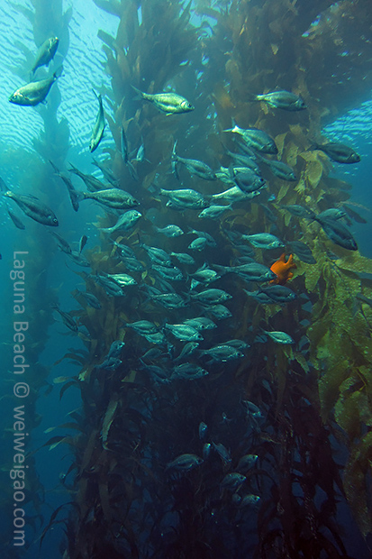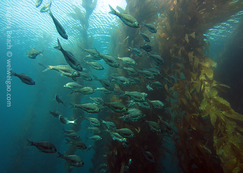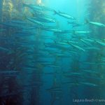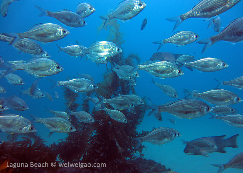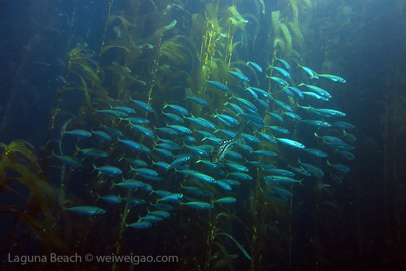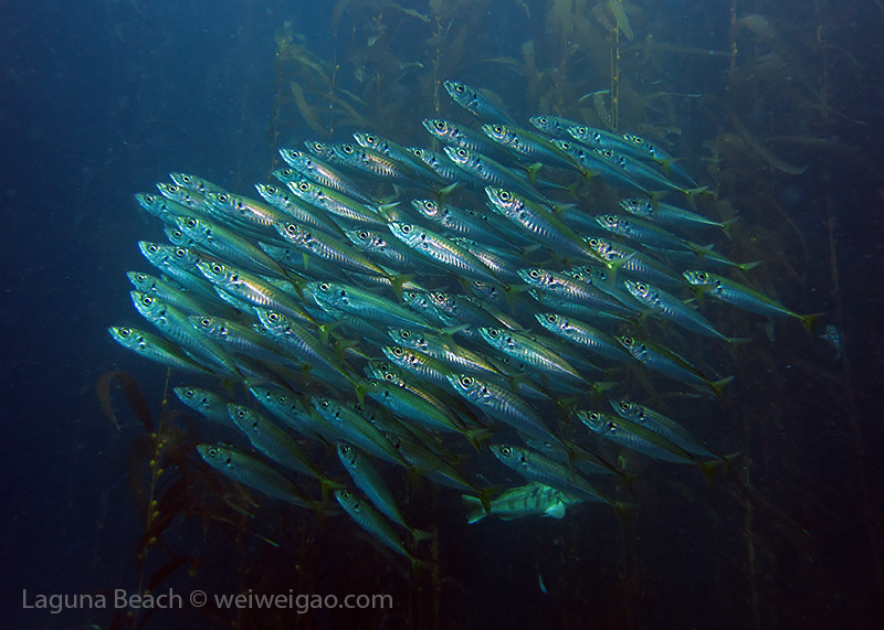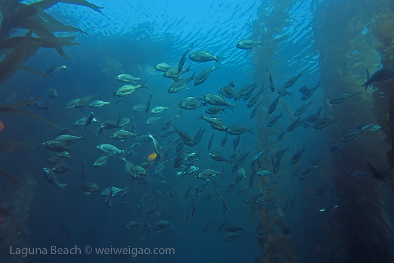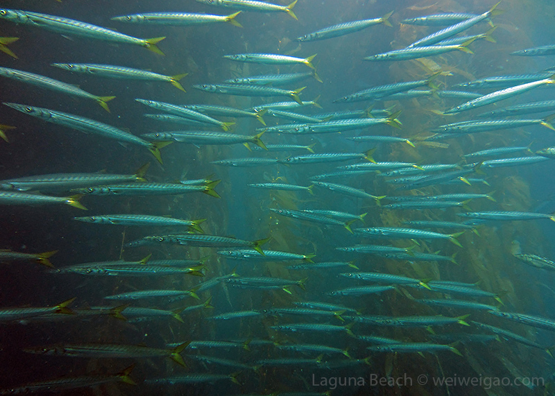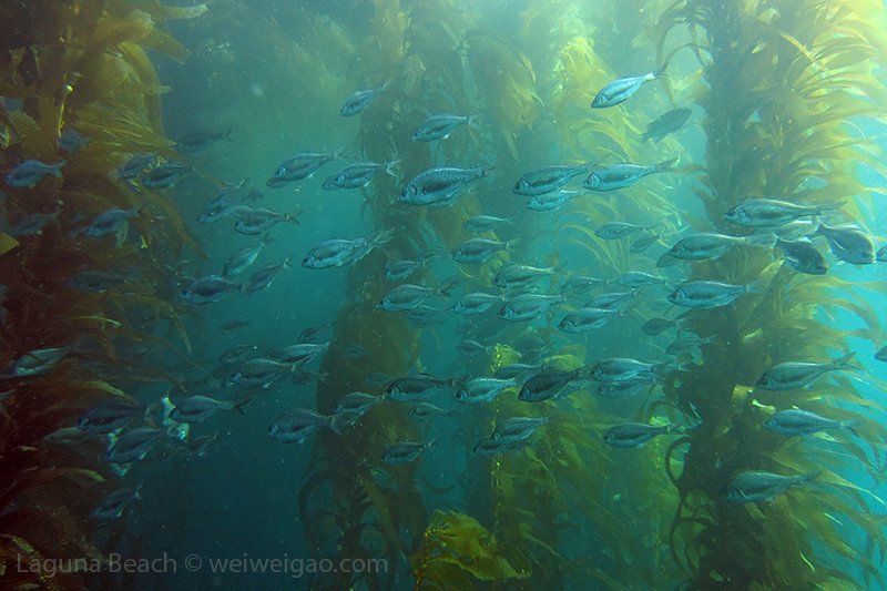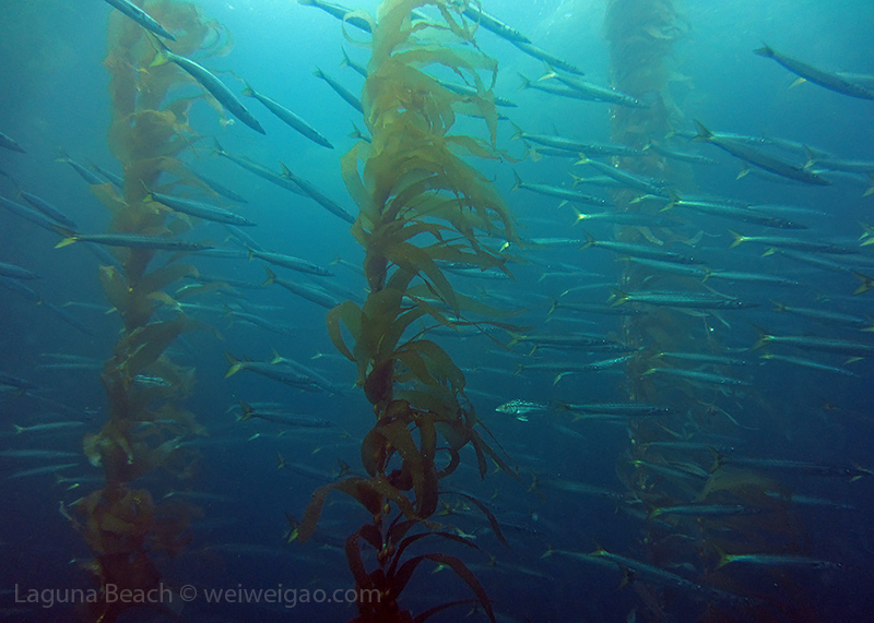 I want to take a break from the sheephead and turn my head to the deep forestry. Then I saw a huge school of California barracuda. It is so large and the whole school of fish forms a wall – something I have never seen before. I am stunned, staring at the fish. I saw smaller schools at the cove before. In my impression, California barracuda is kind of shy. But this school is different. They don’t really swim away from me so I actually get really close. It is a breath-taking experience.