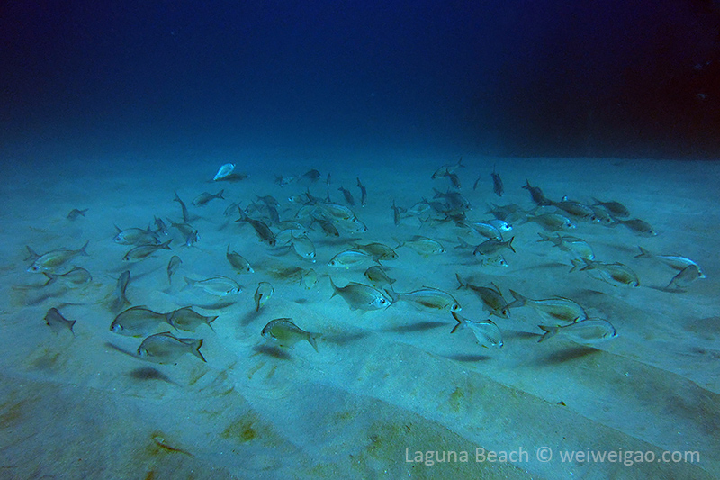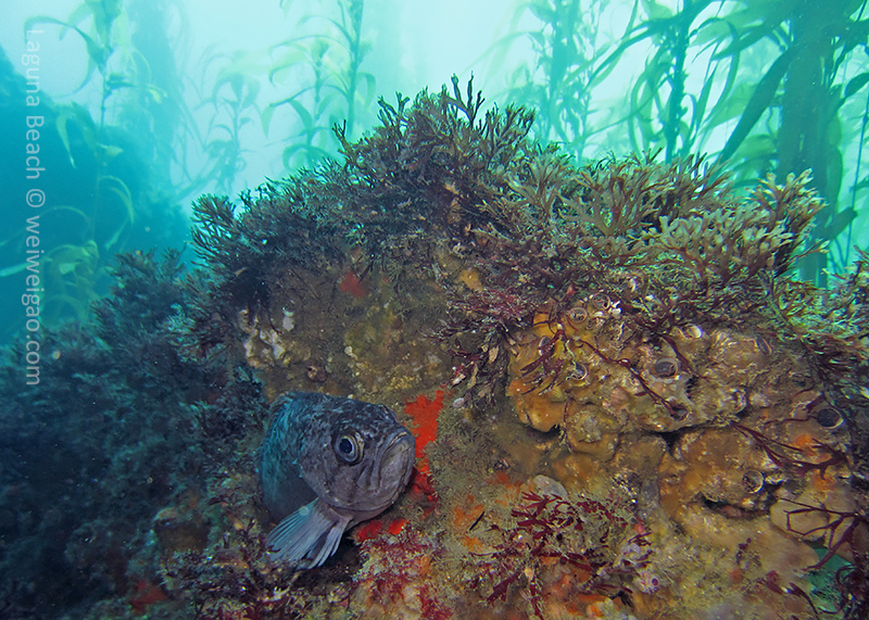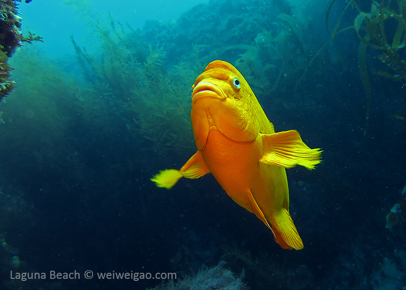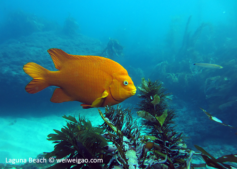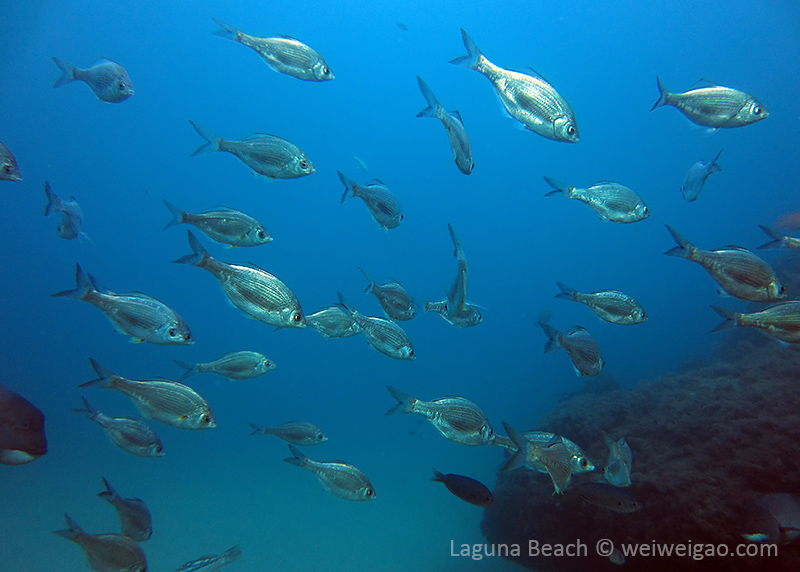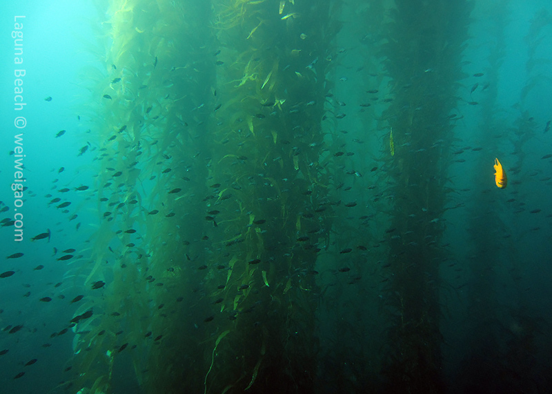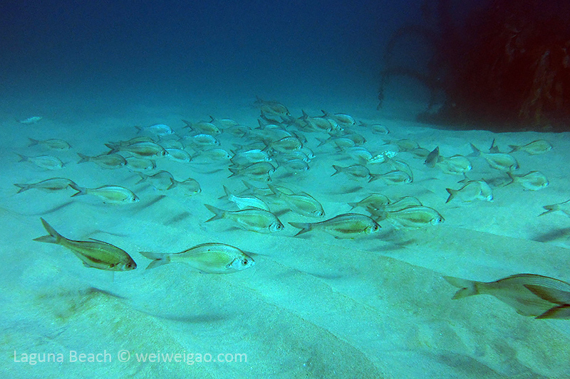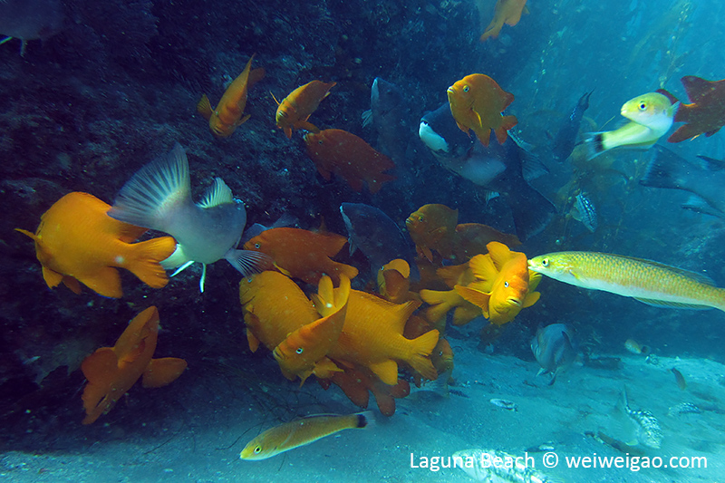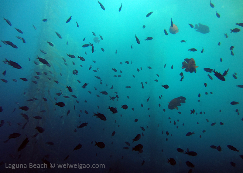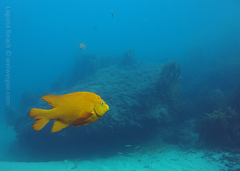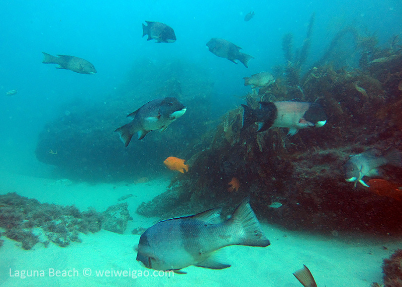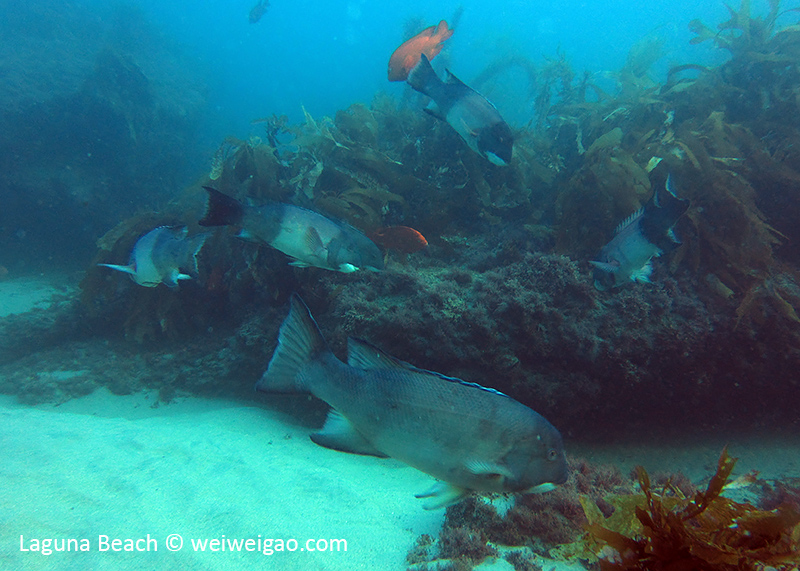Wasting no time, I gear up and head to the southern reefs. There is no wave at all. The kicking out is pleasant. I drop down on the sand right next to the reef and am immediately welcomed by a small group of fish. They are feeding on the sandy bottom but swim to the reef after seeing me getting close. Compared to last time, the kelp looks shorter. There are tons of gariboldi and California sheephead. The view is just beautiful.