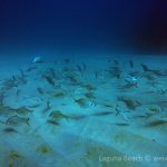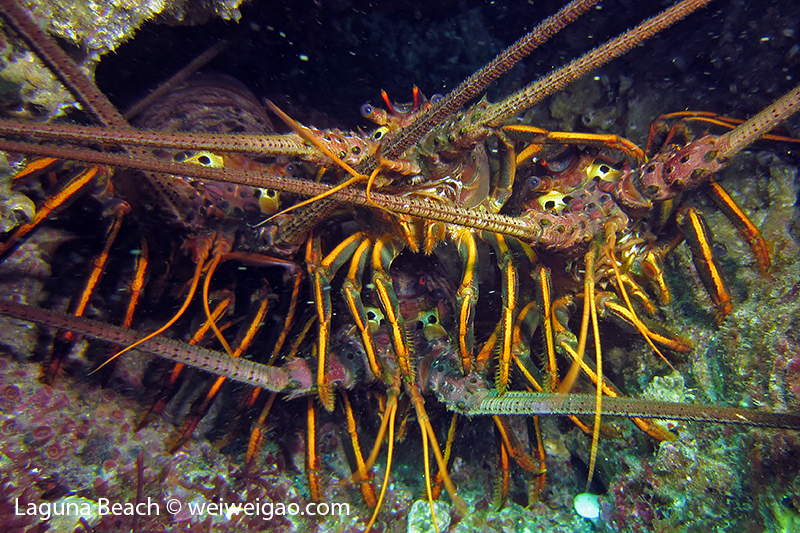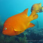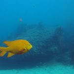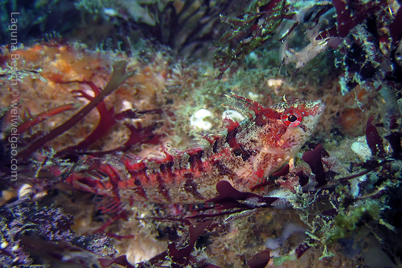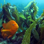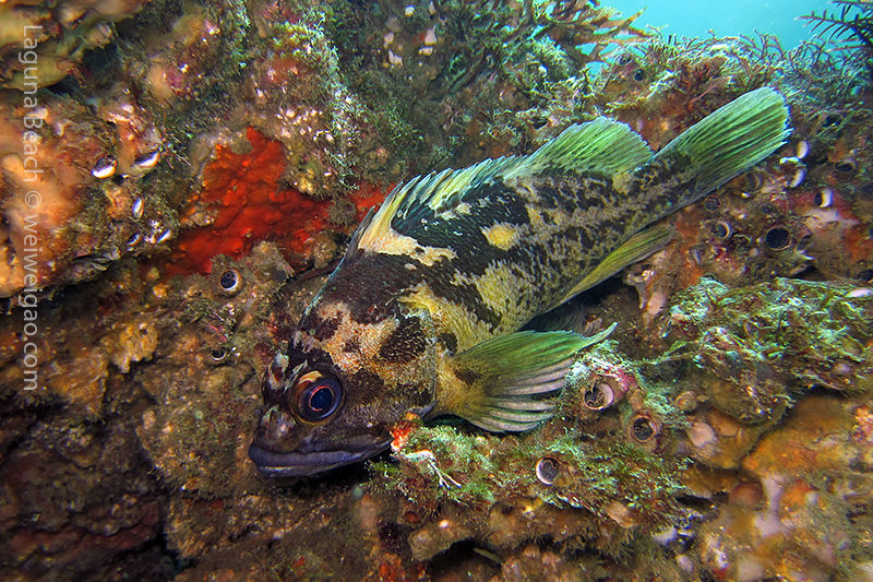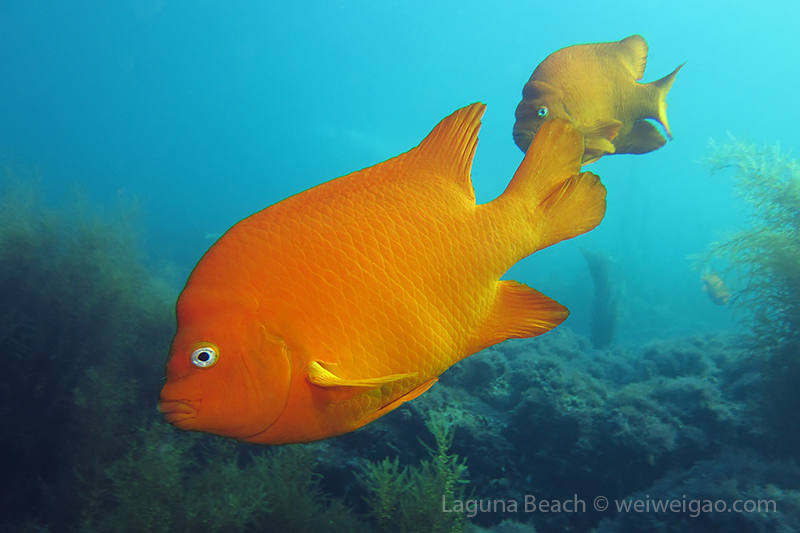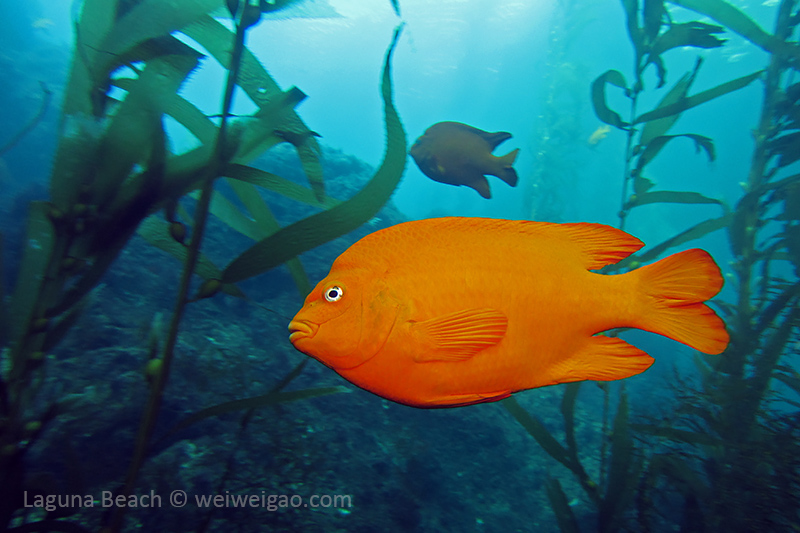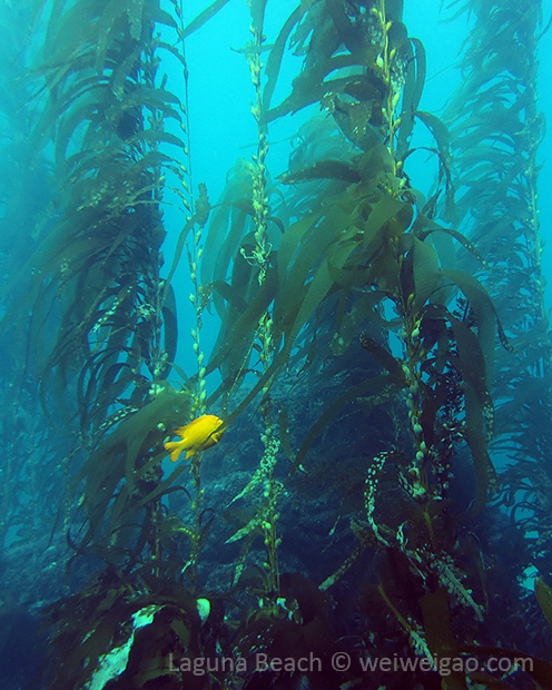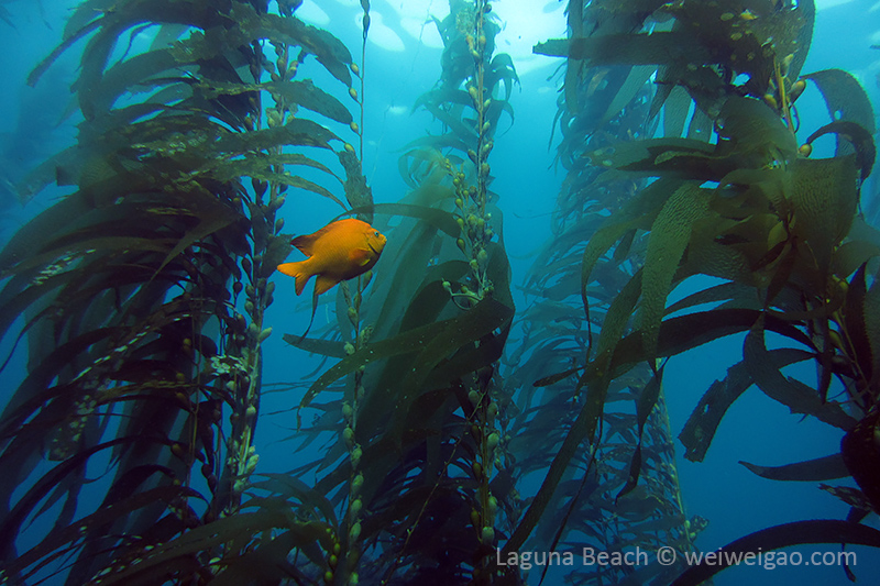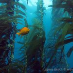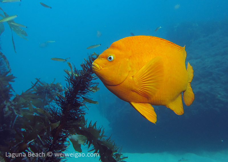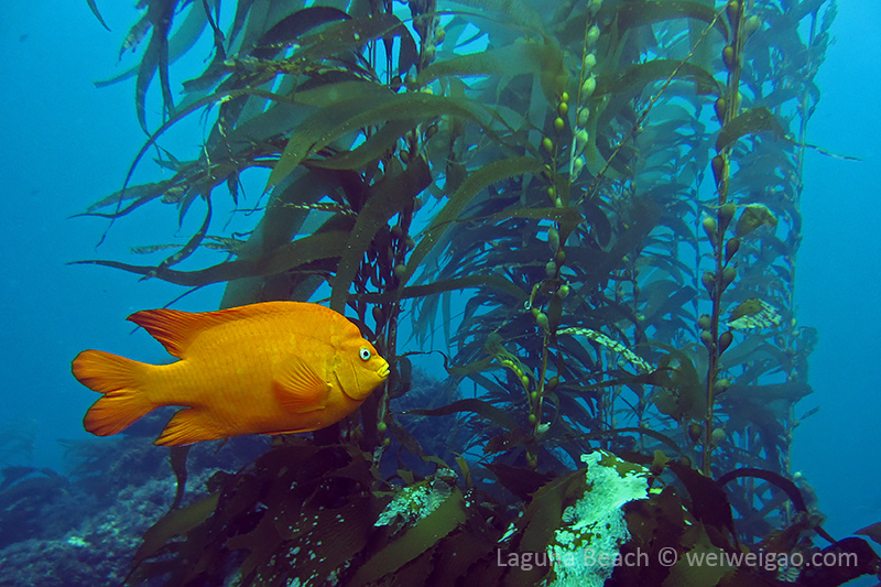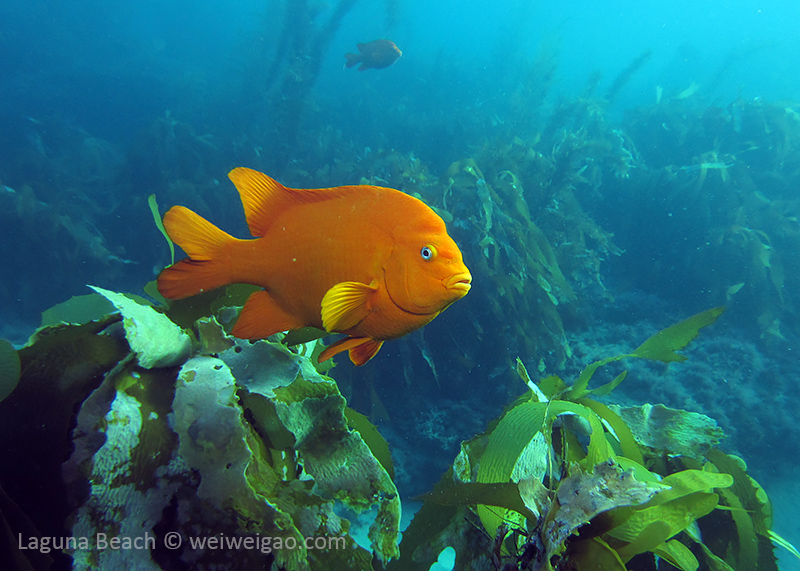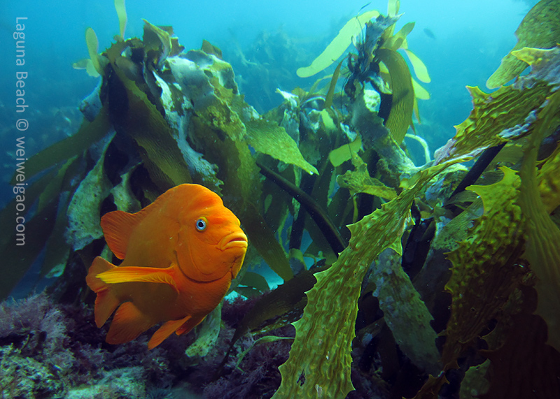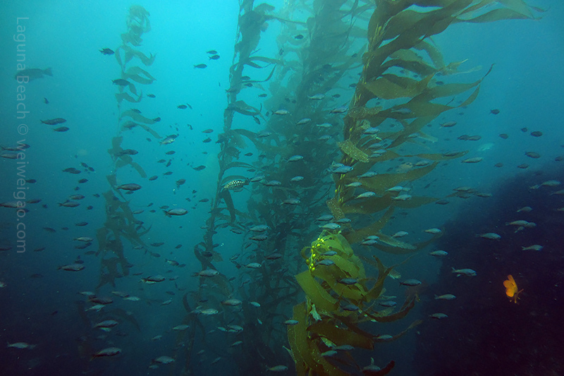 Wasting no time, I gear up and head to the southern reefs. There is no wave at all. The kicking out is pleasant. I drop down on the sand right next to the reef and am immediately welcomed by a small group of fish. They are feeding on the sandy bottom but swim to the reef after seeing me getting close. Compared to last time, the kelp looks shorter. There are tons of gariboldi and California sheephead. The view is just beautiful.