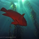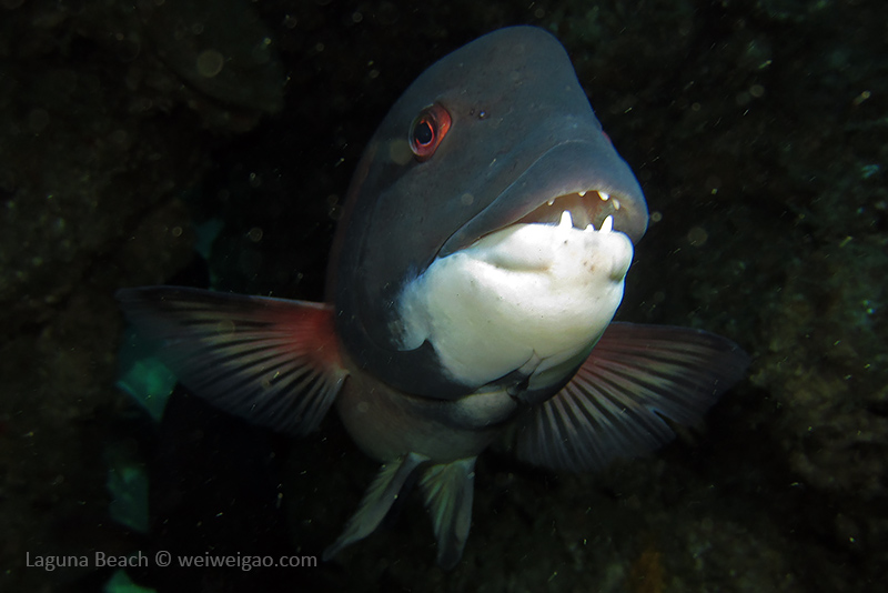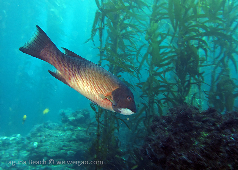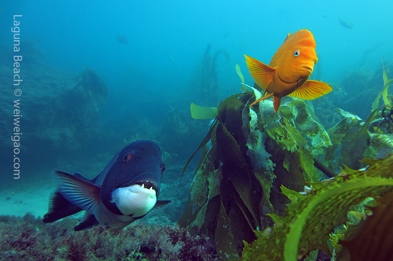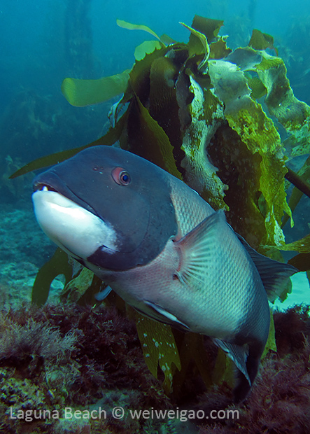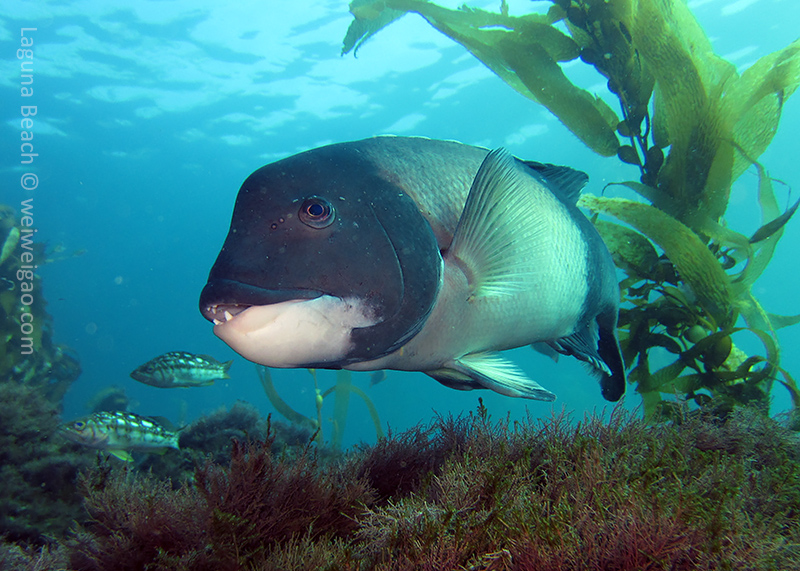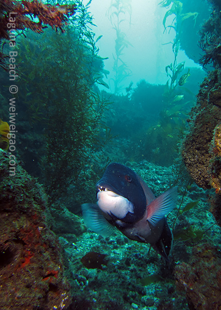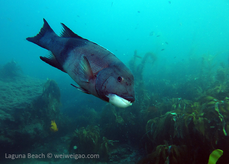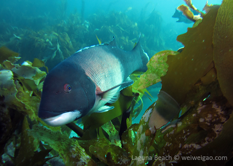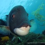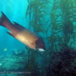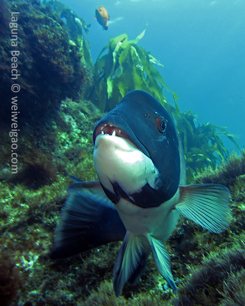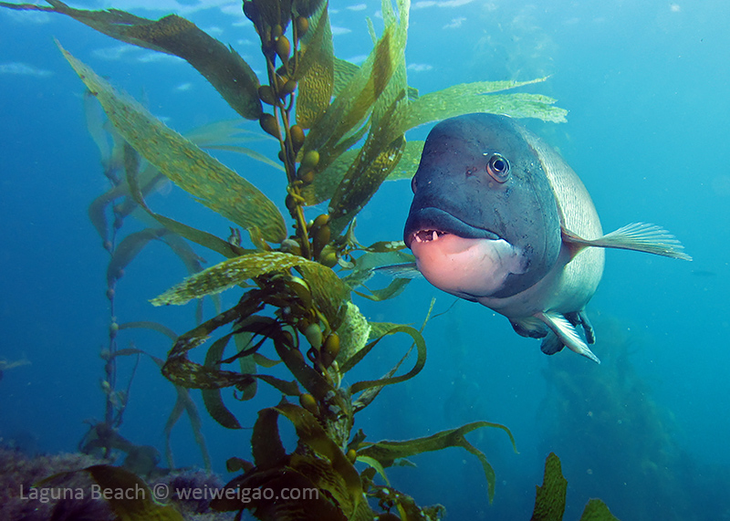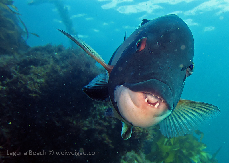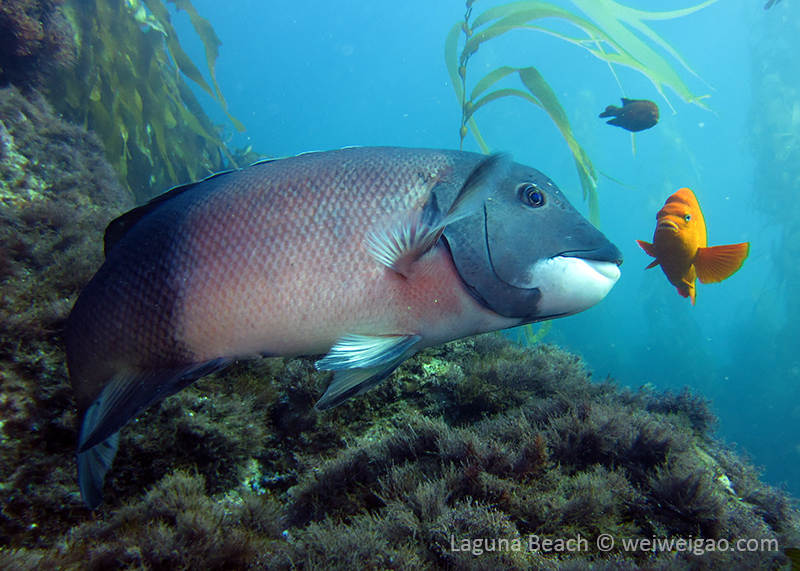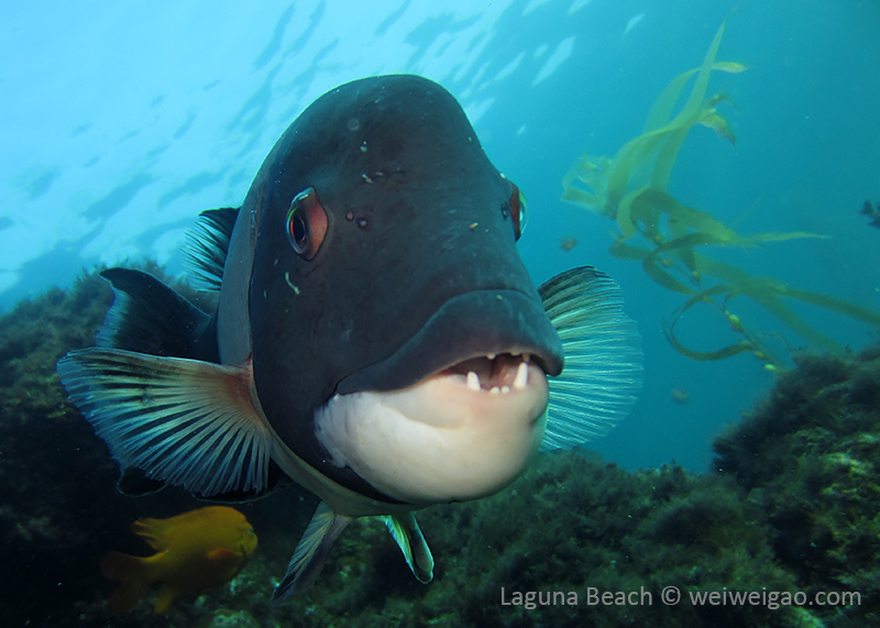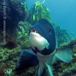 The sheephead is attracted by my presence and follow me all the time. I guess the fin kicking disturbs the sediment, where the fish can find food. So they like me! Some of them are really curious about my camera. They get very close and seem curious to see their own images from lens reflection.