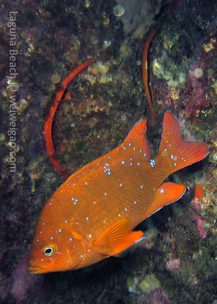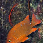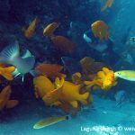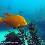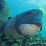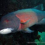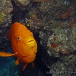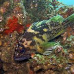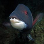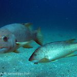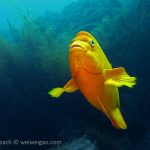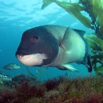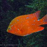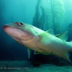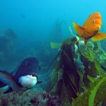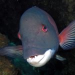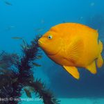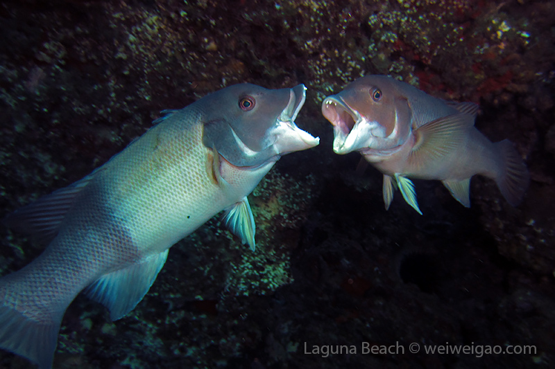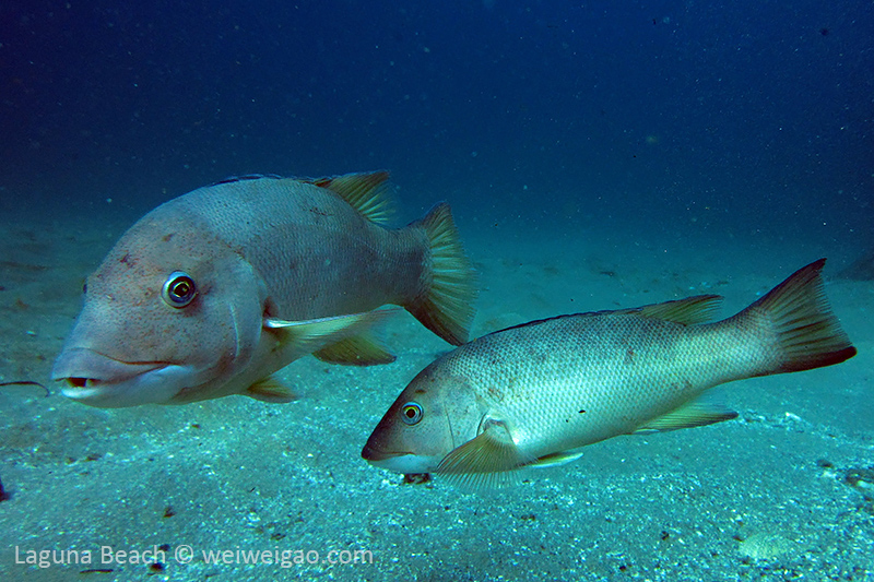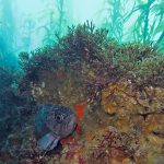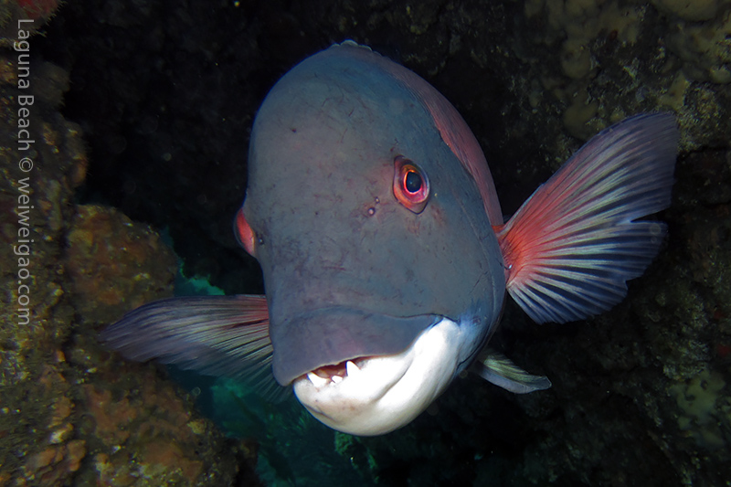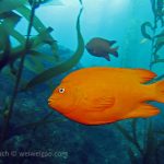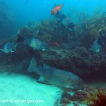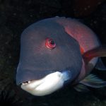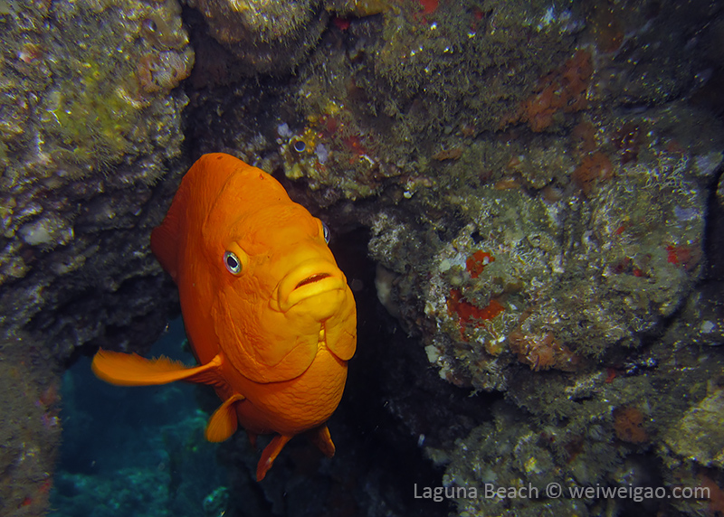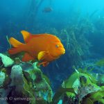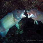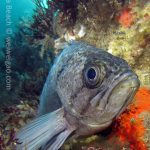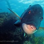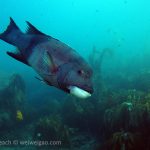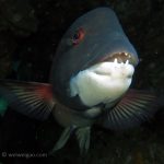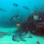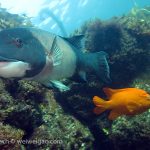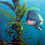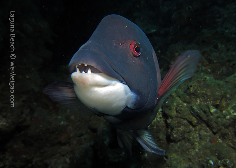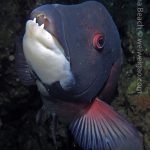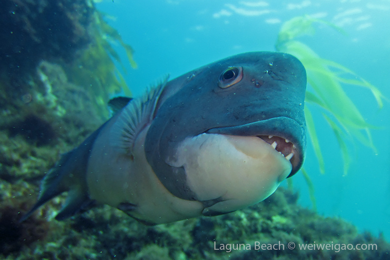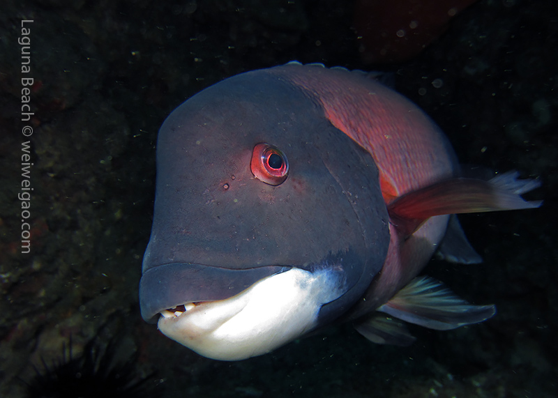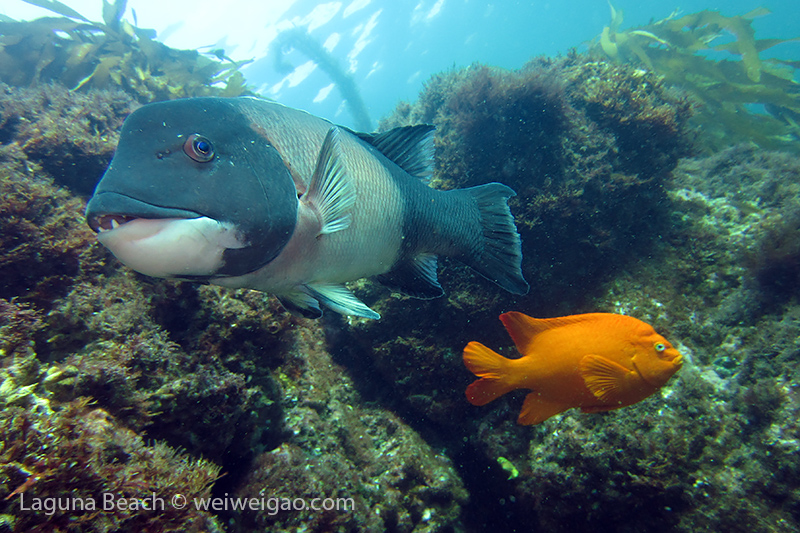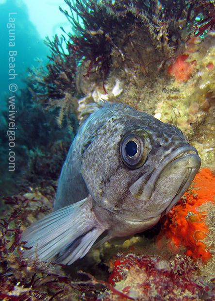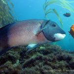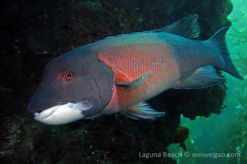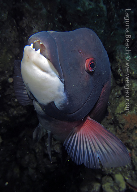 The sheephead is attracted by my presence and follow me all the time. I guess the fin kicking disturbs the sediment, where the fish can find food. So they like me! Some of them are really curious about my camera. They get very close and seem curious to see their own images from lens reflection.