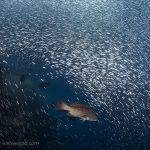 This fish is living on the edge. Under the cliff, there was a big group of leopard groupers, waiting for the moment to catch the pray. And there was skipjack, emerging from far, sprinting, and piercing into the school. The sardine just kept on dancing, presenting life with extraordinary beauty.