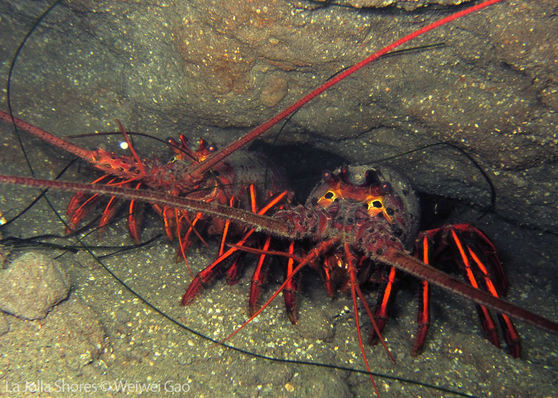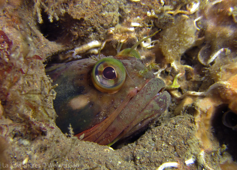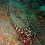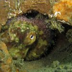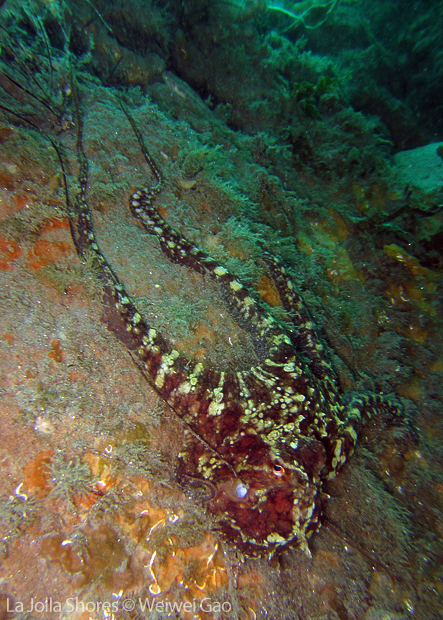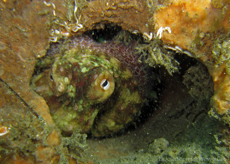 • A big two-spot octopus was out. As soon as I approached, he ran back into the crevice. This was the first time I saw a two-spot wandering out.