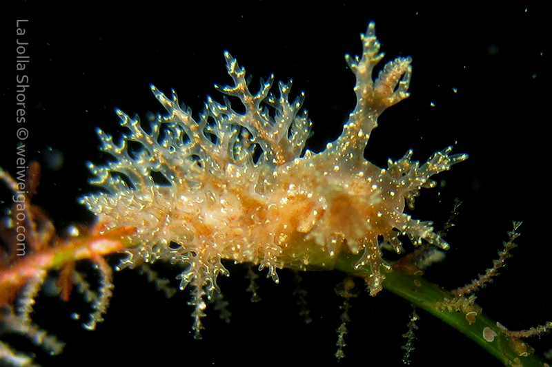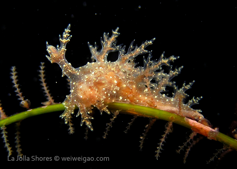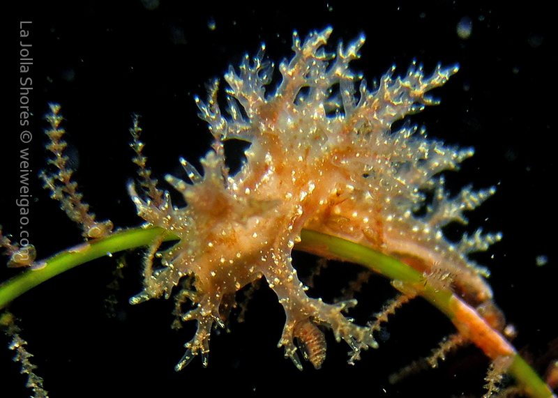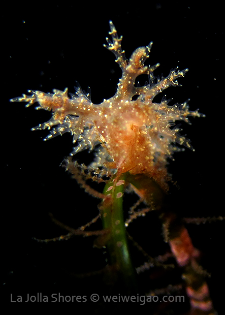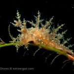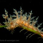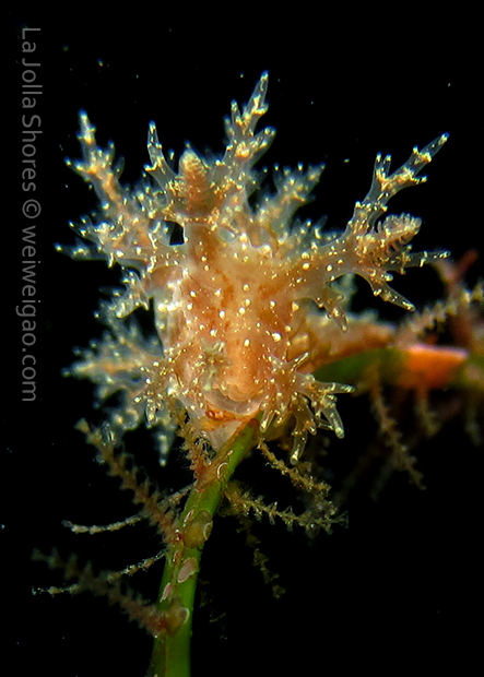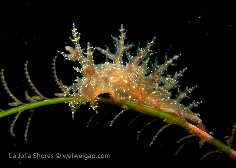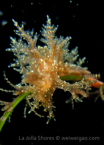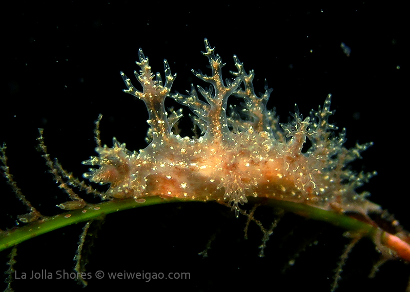 The big swells finally passed. Headed out to the shores for a night dive. The surf was small but the water a bit hazy and surgy. The crap patch is a nudibranch zoo. With a closer look at the grass, I can see all kinds of nudibranch with various sizes. The first encounter was a Dendronotus frondosus at the sandy slope before the patch.