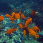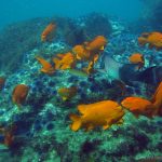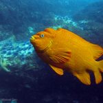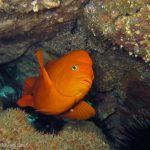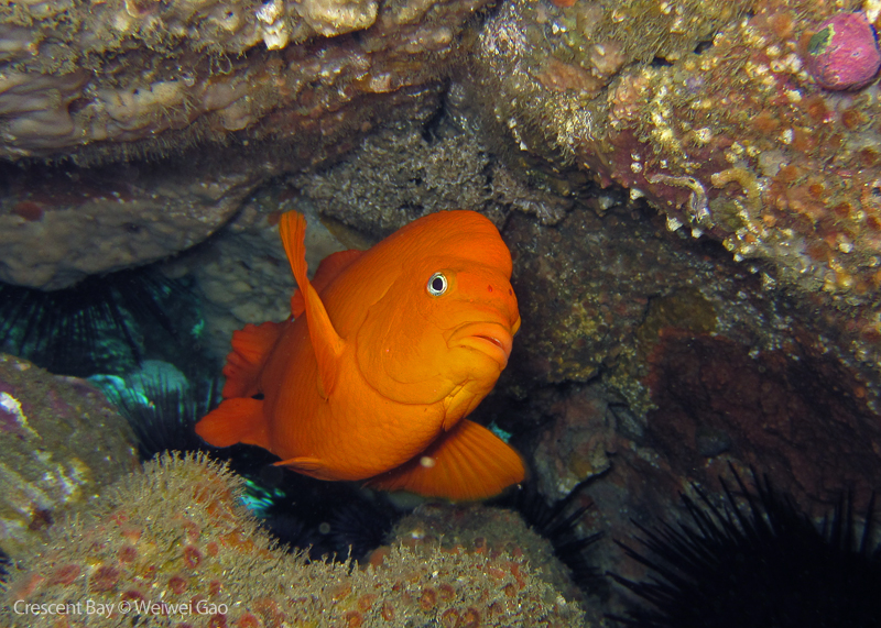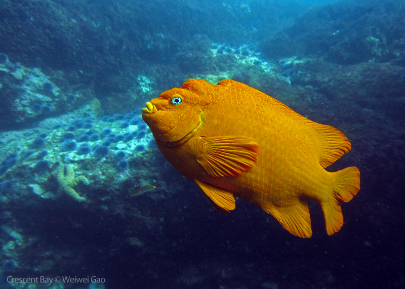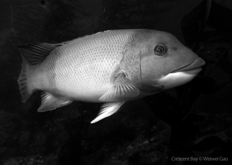 I spent the first dive on the south peninsula. The water was relatively shallow – most of the time I was in 25 ft depth. The rocks from large fingers and it was fun to check out the many crevices. The garibaldi and the shiphead were attracted by the stir-ups so they always followed me. Sometime they were curious and would like to come up to my camera lens. They were probably checking out their reflections on the lens.