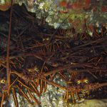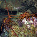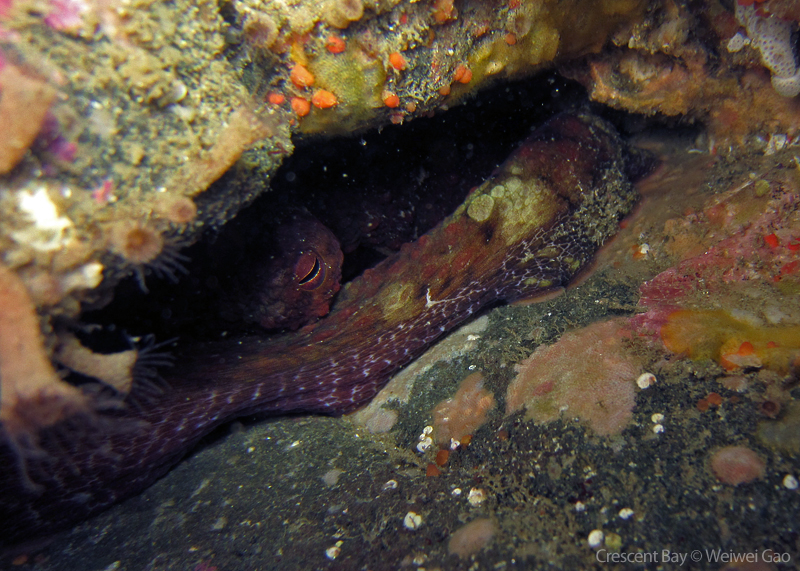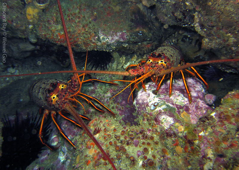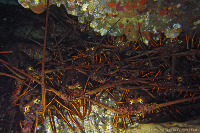 Under a few crevices I found some large groups of lobsters. This reminded me the diving at the north wall of the La Jolla Shores, where we also found holes packed with lobsters. But La Jolla Canyon was muddy and the visibility in the hole was always bad, impossible to take pictures. Here in Crescent bay the rocky structure made a difference. It was very cool to see some many of them packed.
