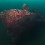 Not sure what to do next, I went up to about 100 ft. The water was very calm and clear. On the far, there seemed to be a large shadow. I decided to swim to it. Slowly, the shadow became darker and the shape of the wreck emerged. Now the camera was on my hand, for this dive, every minute became a bonus.