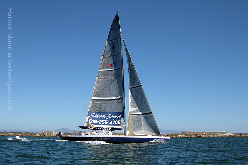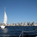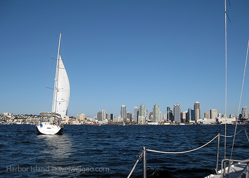 The traffic and the wind condition in the channel, constantly changing, make the sailing interesting. In the open ocean, the wind becomes a lot more steady, making the voyage a lot easier. We spent a few hours out there before we headed back to the bay. Here is a view of San Diego skyline from out boat.