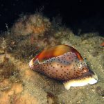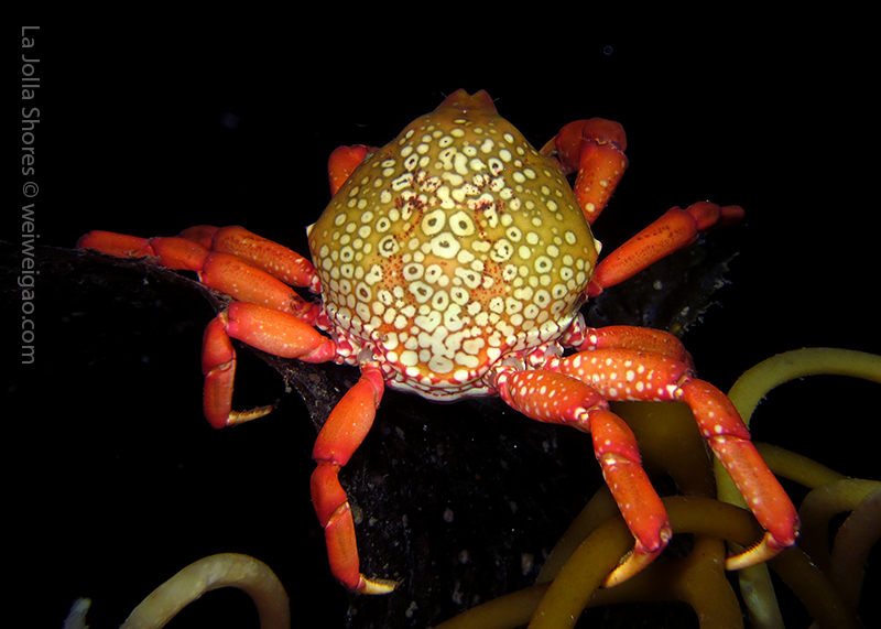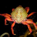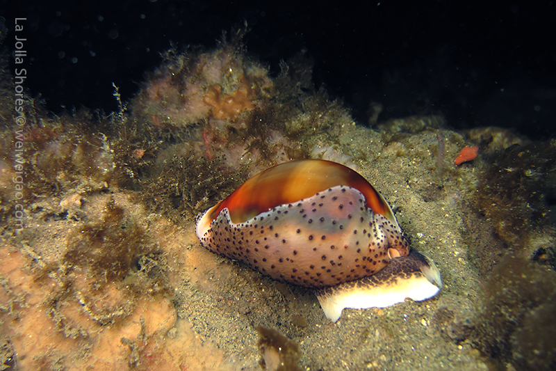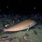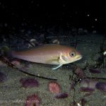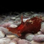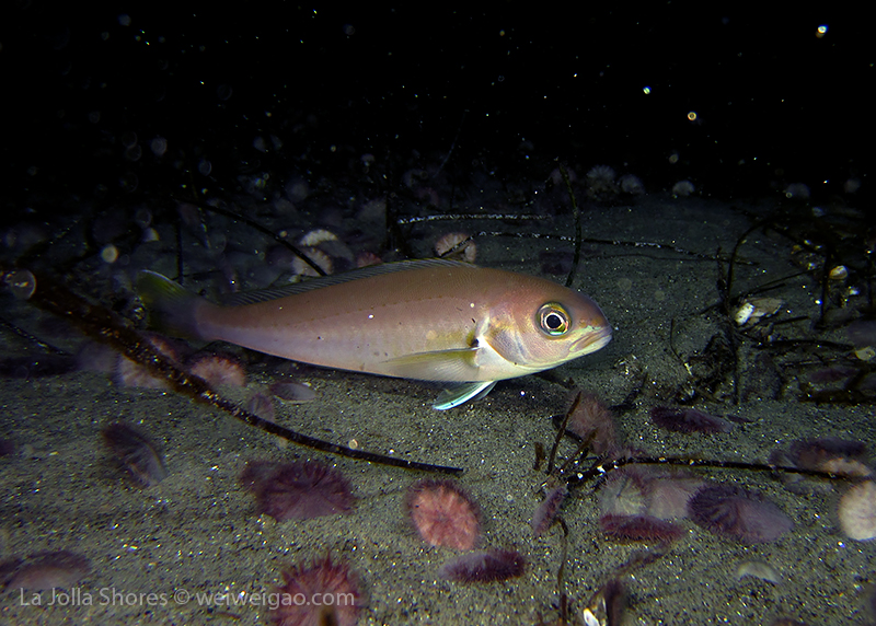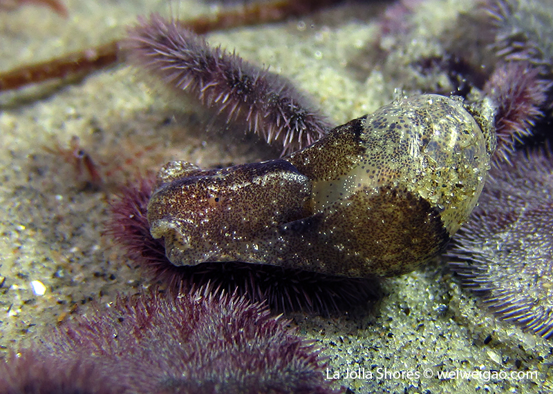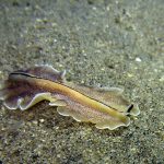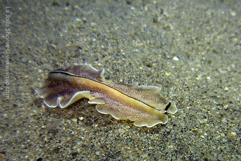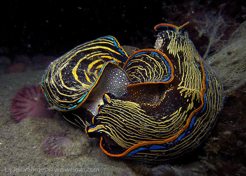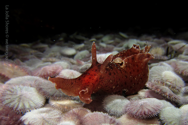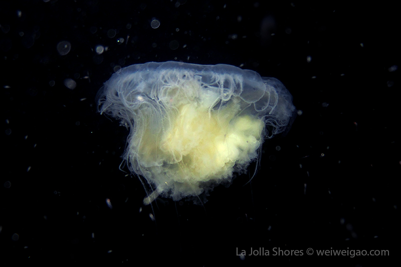 This time, instead of suspended and swimming in the water column, a fried egg jellyfish appeared lying on the ocean ground, upside down, with the bell bent backward, motionless. I watched from distance, thinking that it might be dead. I swam toward it to get a closer look. Surprisingly, it sensed my approach and started to move. As if my light disrupted its sleep, now the jellyfish became awake. Its bell bent back gently and the body turned upside. It started swimming toward the surface and faded slowly into the pitch black.