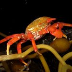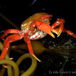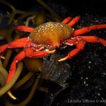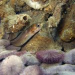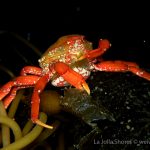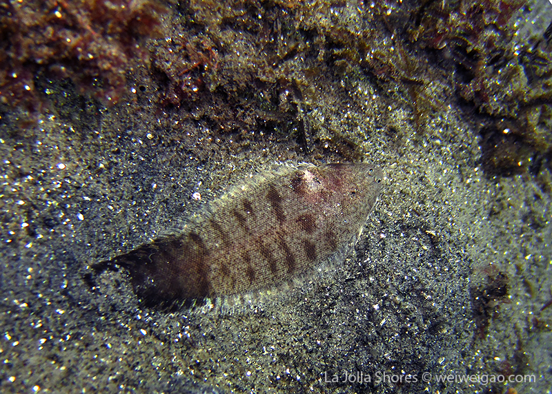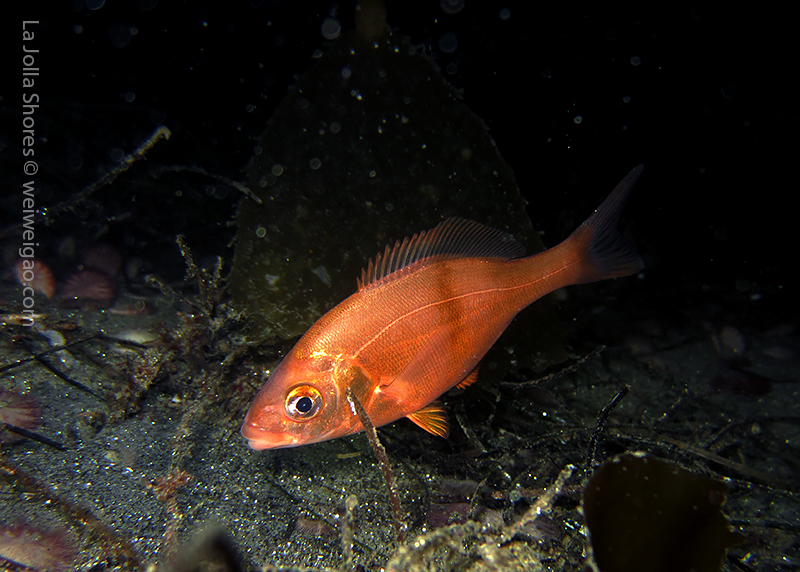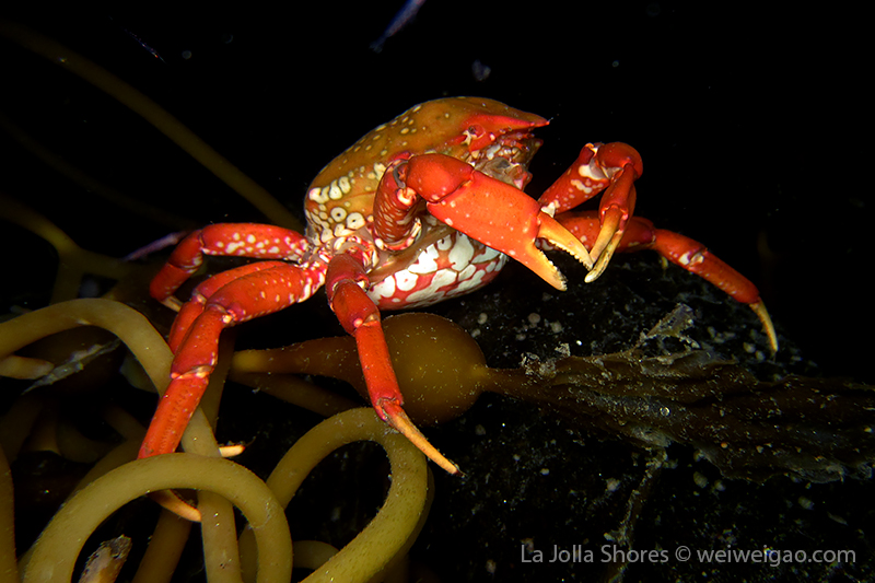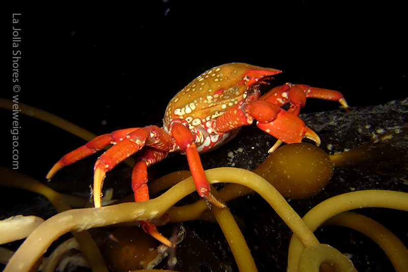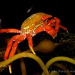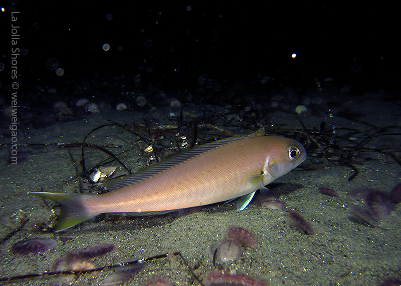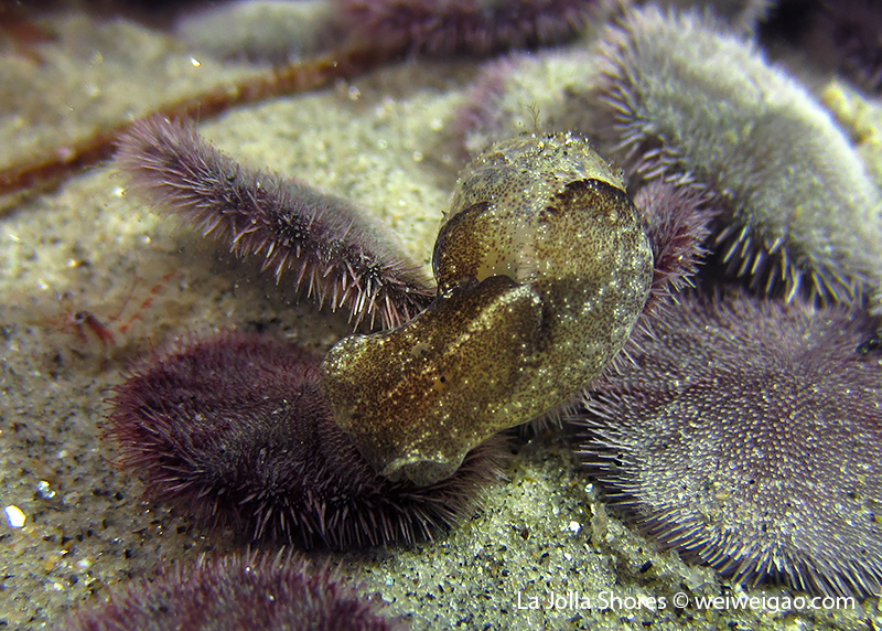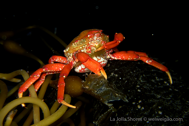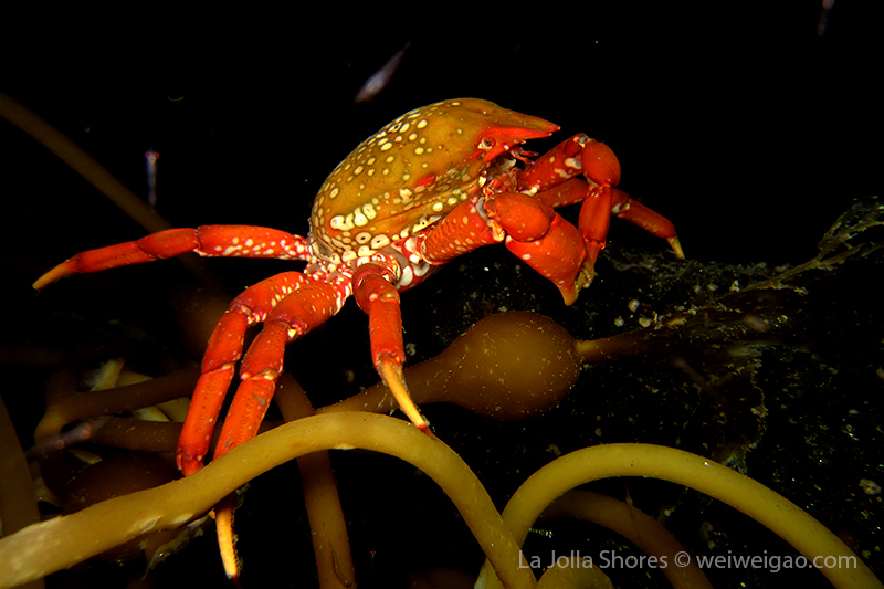 This time, instead of suspended and swimming in the water column, a fried egg jellyfish appeared lying on the ocean ground, upside down, with the bell bent backward, motionless. I watched from distance, thinking that it might be dead. I swam toward it to get a closer look. Surprisingly, it sensed my approach and started to move. As if my light disrupted its sleep, now the jellyfish became awake. Its bell bent back gently and the body turned upside. It started swimming toward the surface and faded slowly into the pitch black.