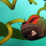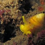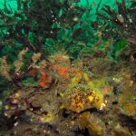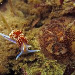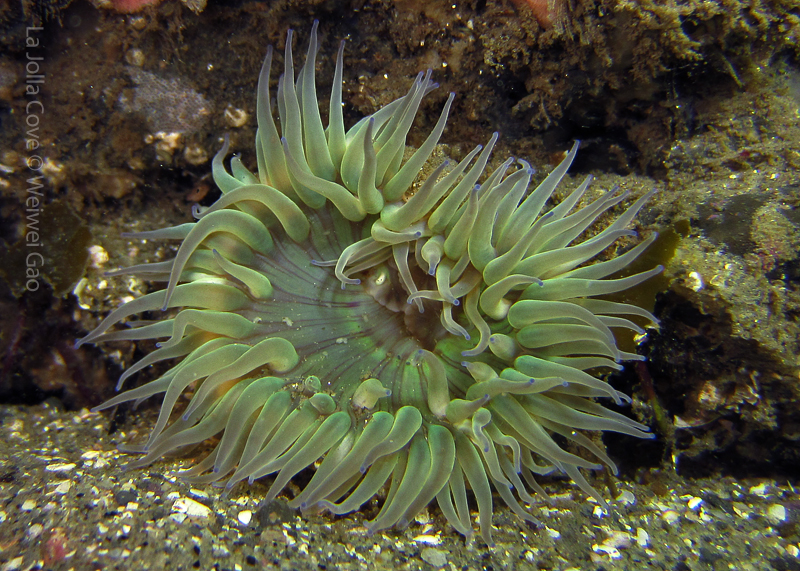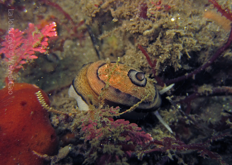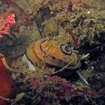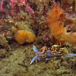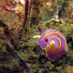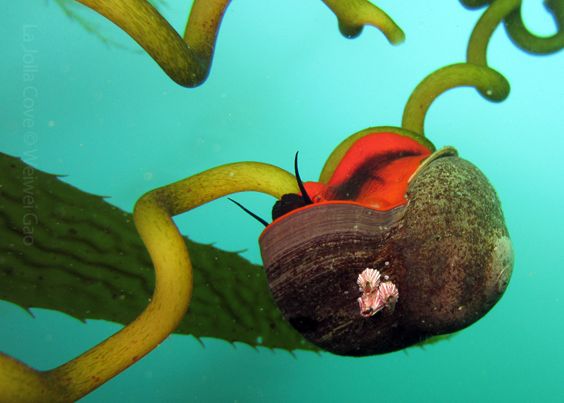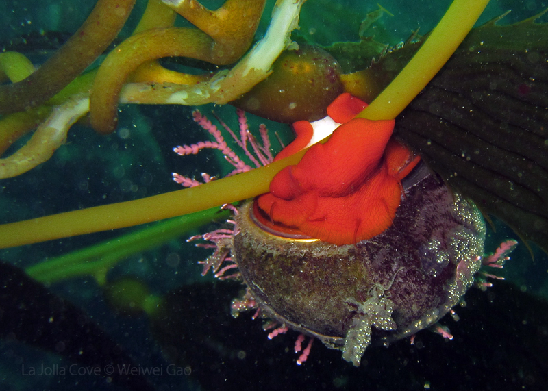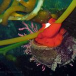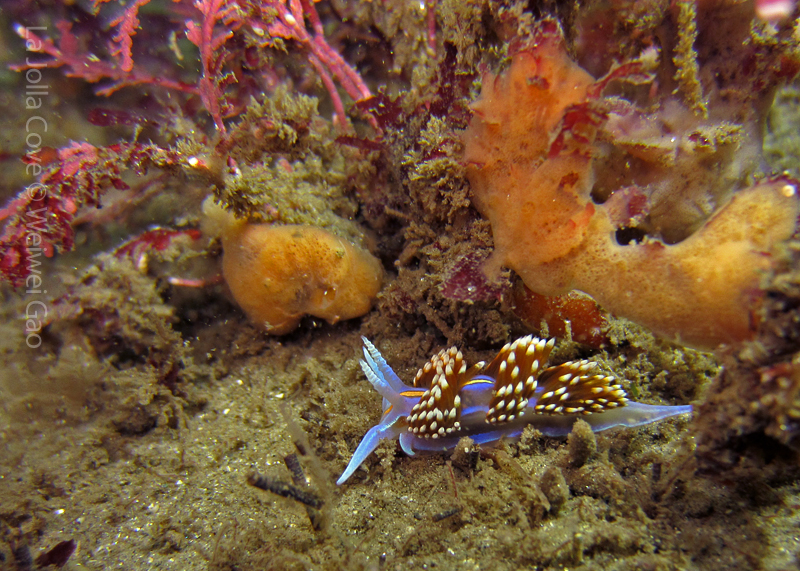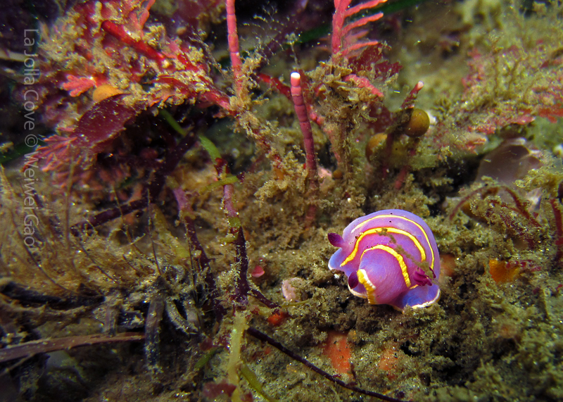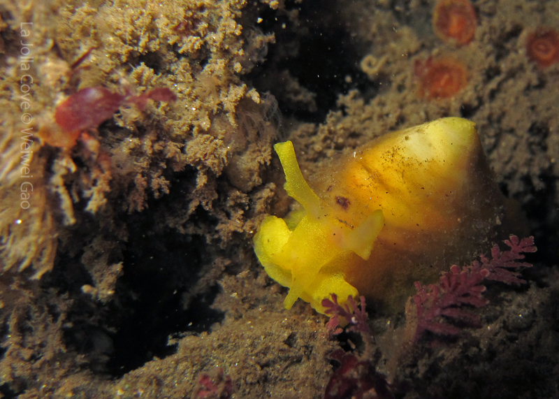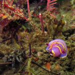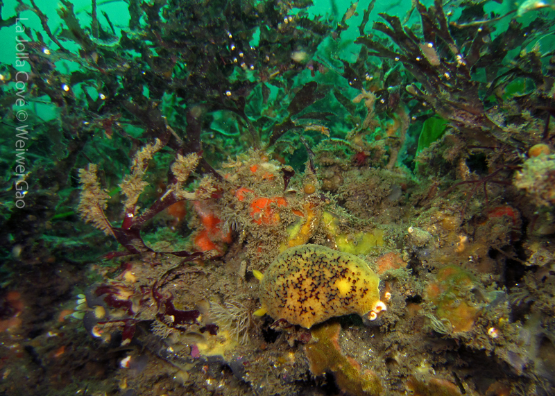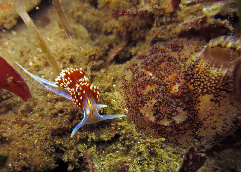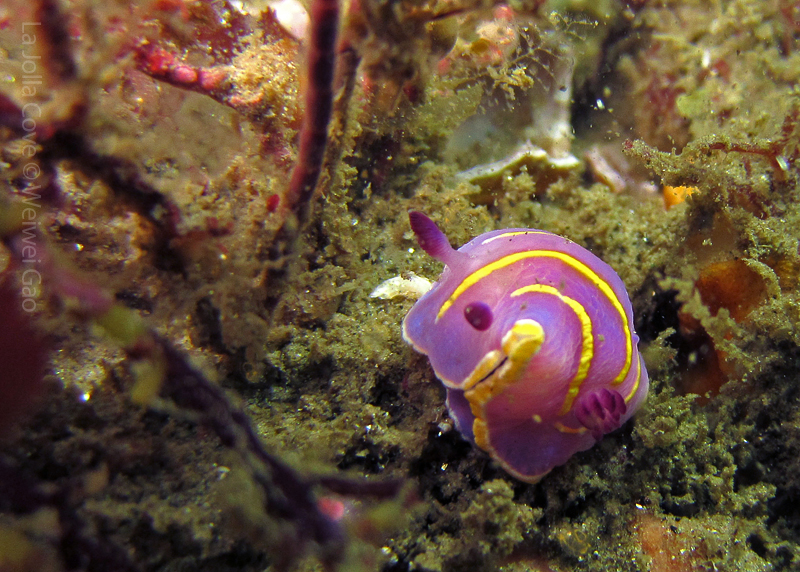 In the dive last time at the cove with Mike, I got to see a gorgeous Hopkin’s Rose, among others. However, the cove never gave me an impression for the nudibranchs. Thanks for Mike and his magic detection, today’s dive changed my mind. After we swam out of the cove, we turned due west and headed to the kelp bed. It looked like that the kelp had grown a lot and therefore we could not swim out too far. After we dropped down, the visibility was not very good. We spotted a very cute Tylodina fungina (a snail with a shell all in yellow color). After a plenty of shots, we headed further west. For quite a while, the visibility was poor and I didn’t see anything exciting. Before I almost lost all the hope of great findings in this dive, Mike signaled me and pointed a MacFarland’s Chromodorid to me (the purple nudibranch with yellow stripes). Right next to it, we found another Hermissenda crassicornis. Although those nudibranchs are quite common at other dive sites, this was the first time I saw them at the cove. The dive suddenly became quite interesting – the visibility opened up and we kept on finding interesting creatures. It turned out to be a very pleasant dive!