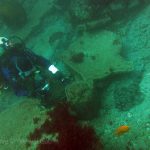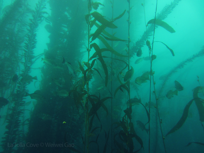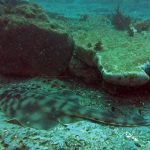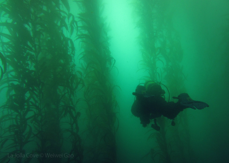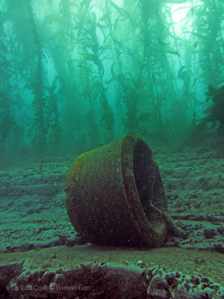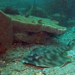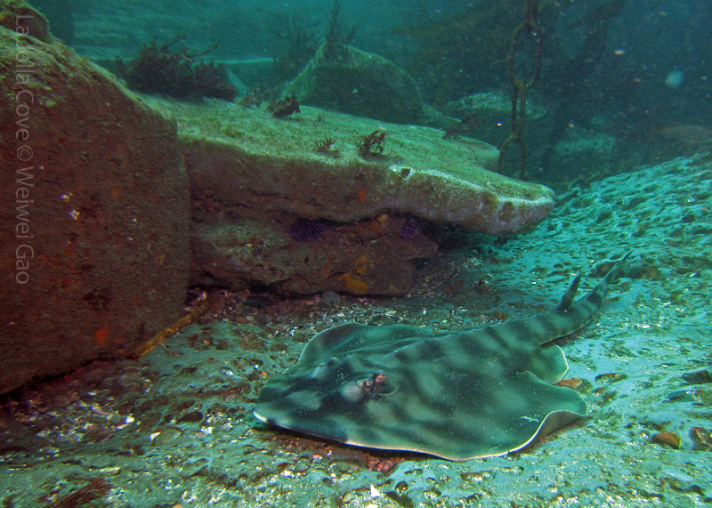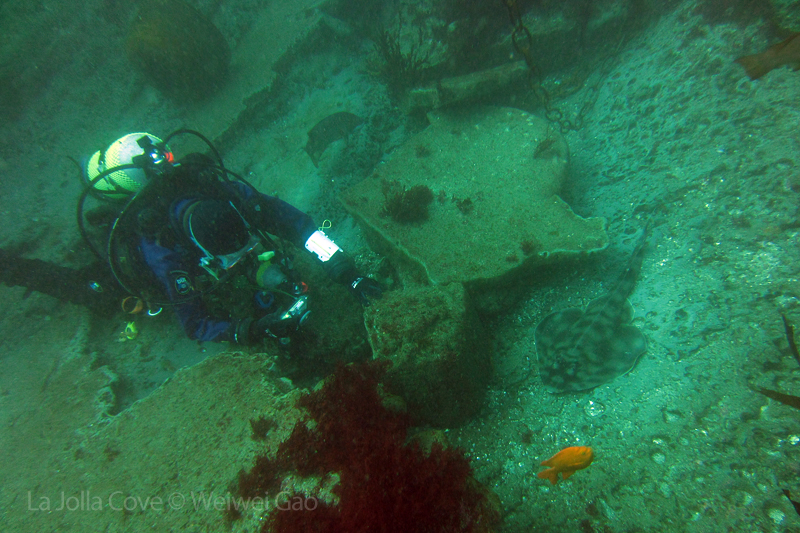 Jackie then joined me for another dive. We took our time to gear up and decided to do a shallow diving toward the buoy A. As both of us were focusing on taking pictures, we went very slow. Normally, I don’t expect much between the shore and the buoy A. But today, we came across nearly everything – sea lions, harbor seals, large school of barracuda, among many other. Around two-thirds into out dive, we arrived at buoy A. Although most of the time, this is my drop off site, I had never examined the area underneath. The structure was interesting – a large flat rocky bottom with a wide set of steps to the south east and the kelp bed on the background was breath taking. Near the step, we saw a guitar fish. Most of the time guitar fish is dull to look. They are flat, often hiding themselves with the kelp or the grass. But this time it was a good photo opportunity. We took turns to photograph the fish and the pictures looked good.