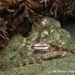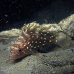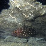 At site, for the first 30 min I didn’t see any sign of a dark pearled fish and left to the V point. Before I completely gave up, I wanted to give it another try so I turned back. Waited for a while and saw two rock fish switching their little dens. I noticed one fish is a bit wider than the other and darn…that was the SS grouper.