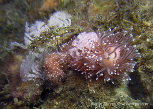 I lined up with Vallecitos street and dropped down right at the main draw. While I was about to swimming south, a group of four Cuthona divae with ribbon like eggs appeared right in front of my eyes on the wall. I only saw Cuthona divae once before and a group of them together was a real treat! After numerous shots and many minutes of video, I was finally ready to march along.