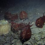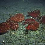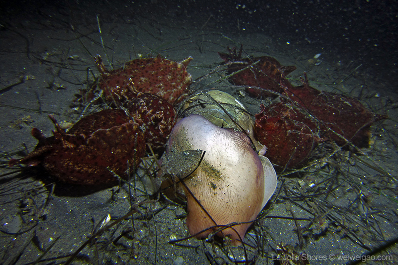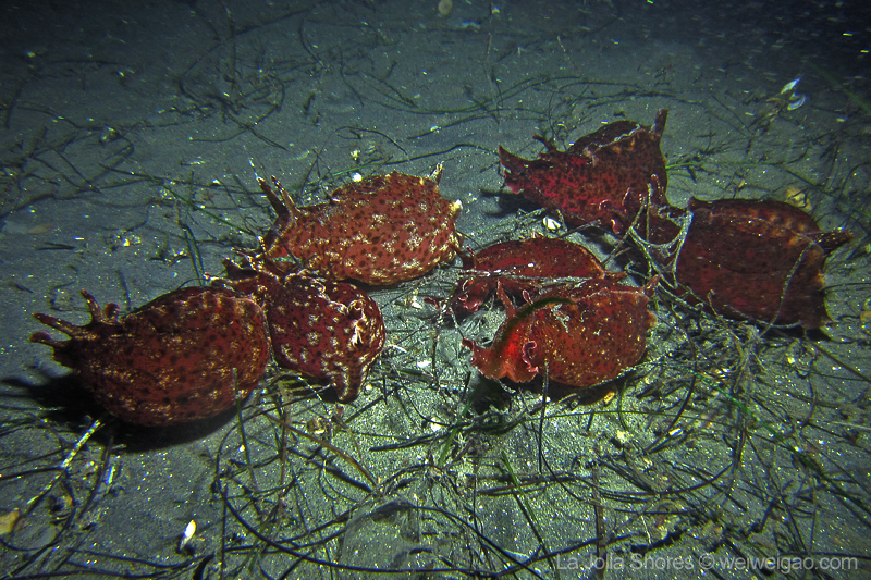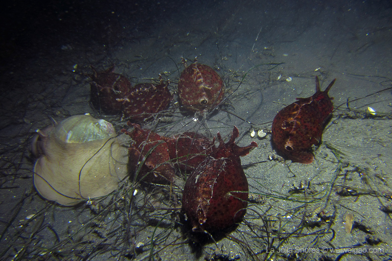 However, before I started swimming, I noticed a large number of sea hares emerging from the grassy bottom. Clearly, a sea hare migration was taking place. It seemed like they were coming up from the draw and marching east toward the canyon wall. Head-to-tail they formed lines, merging from different angles while they slowly marched up the slope. Unable to hold themselves against the surge, they swang along, sometimes rolled over. However, under such apparent weakness, a strong force inside these creatures was driving them relentlessly toward the same destination. Through my lens, I enjoyed a Nature’s magnificent show.