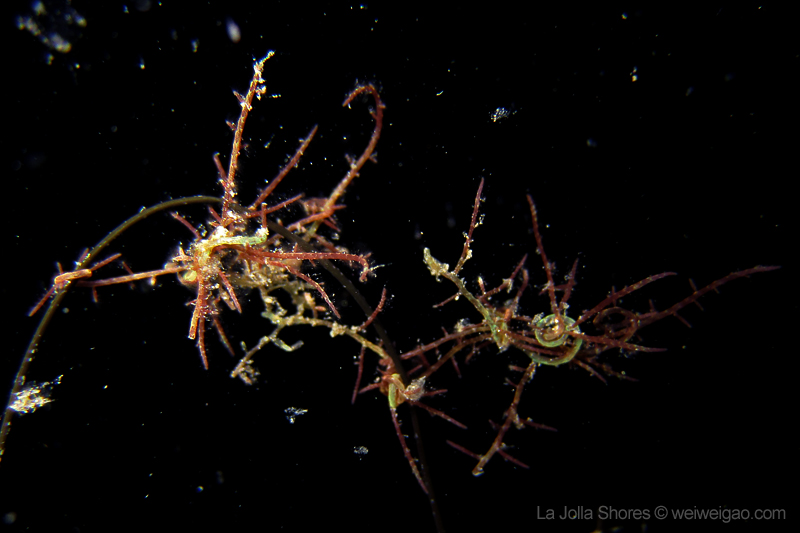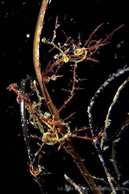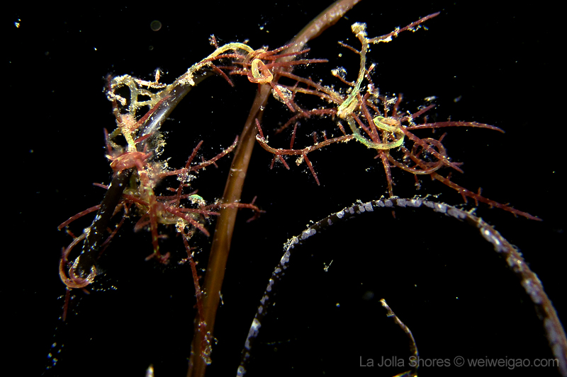 In particular, I spotted some worm-like creatures on the grass. Initially I thought they were skeleton shrimps but I doubted. It seemed like there were a bunch of them, each curled and hooked end-to-end, forming a chain. The one at the end secured the whole chain by wrapping around the grass. They were in two colors – the green ones surely were some worms because I saw their movement; the red ones, however, might be just some algae.