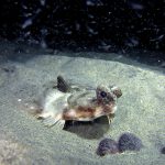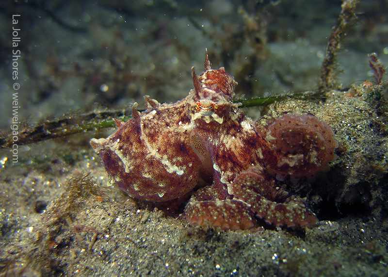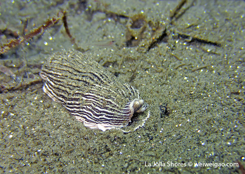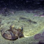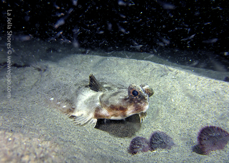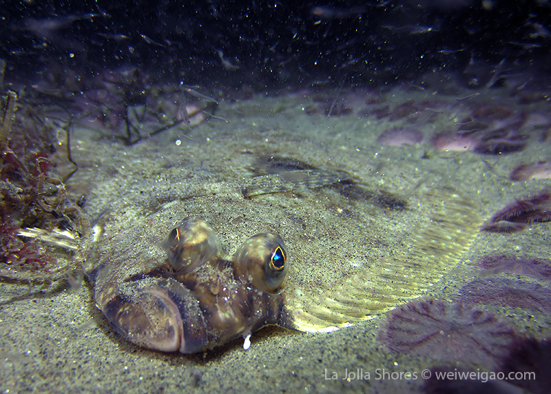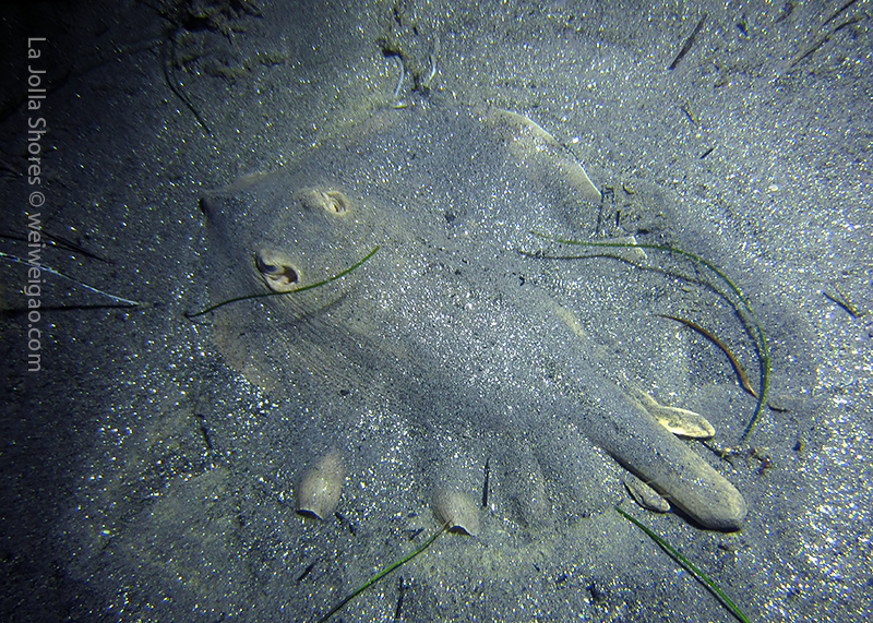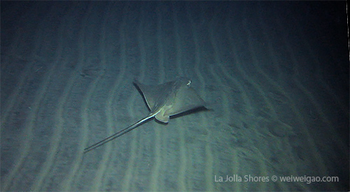 From the V point, I started heading back. At about 15 ft water, the moon light was so bright that I could see the bottom of the ocean without my dive light. Then a baby bat ray appeared. Usually, the bat ray was shy. You can follow them a little while but once they notice the presence of a diver they sprint away. But this one let me follow for a long time.