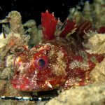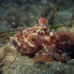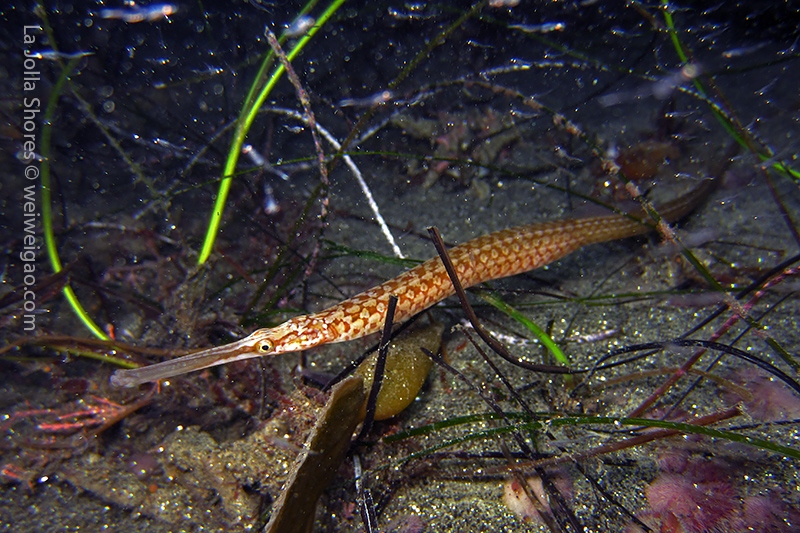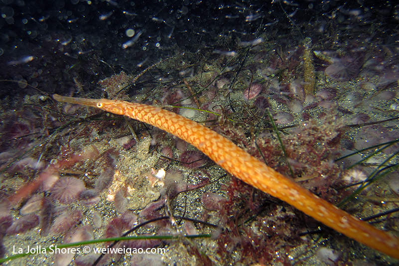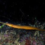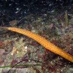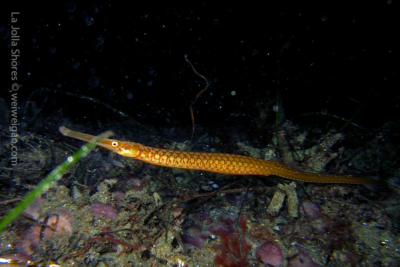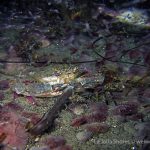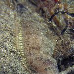 I dropped off way north but in the shallow sandy bottom. The condition was stellar – fantastic visibility and calm water. As soon as I dropped down, I spotted a pair of pipe fish right next to me. In most encounters, I skipped taking pictures of them because their slim body is hard to focus. But this pair was different. They had a golden outfit, shinning brightly.