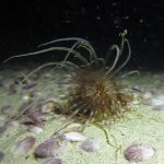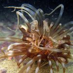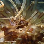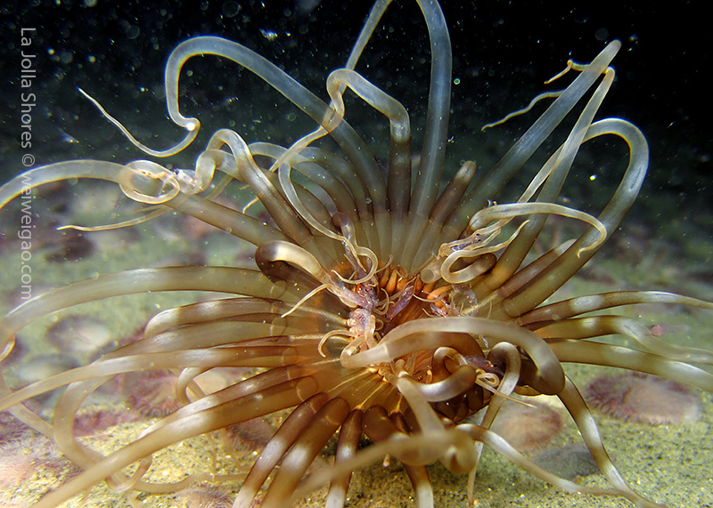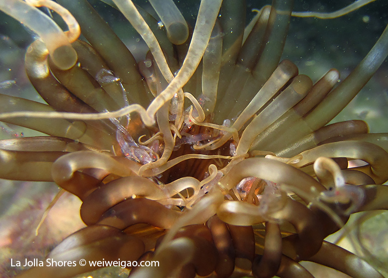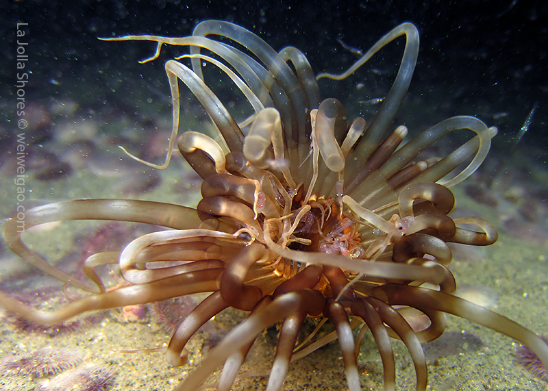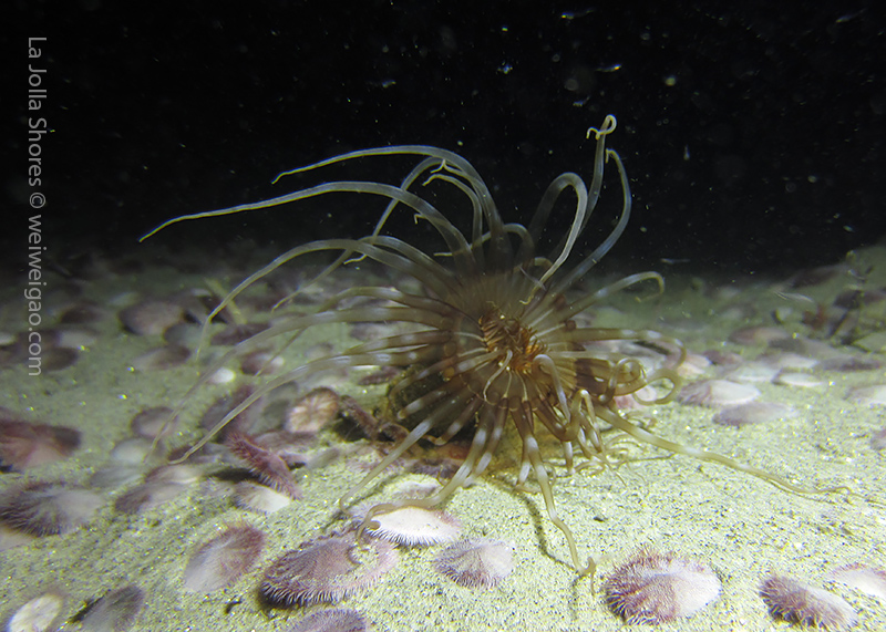 Speaking of predators and prays, a sea anemone near the patch was another example. While shining the light of this creature, the cone of light attracted a large school of krill. The sea anemone, which was swinging leisured with the current, instantly became charged.