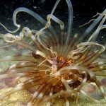 All the tentacles waving fast, extending out and bending back, transporting newly caught krill to the mouth. The appearance of the sea anemone, its state of vegetation, is deceiving.